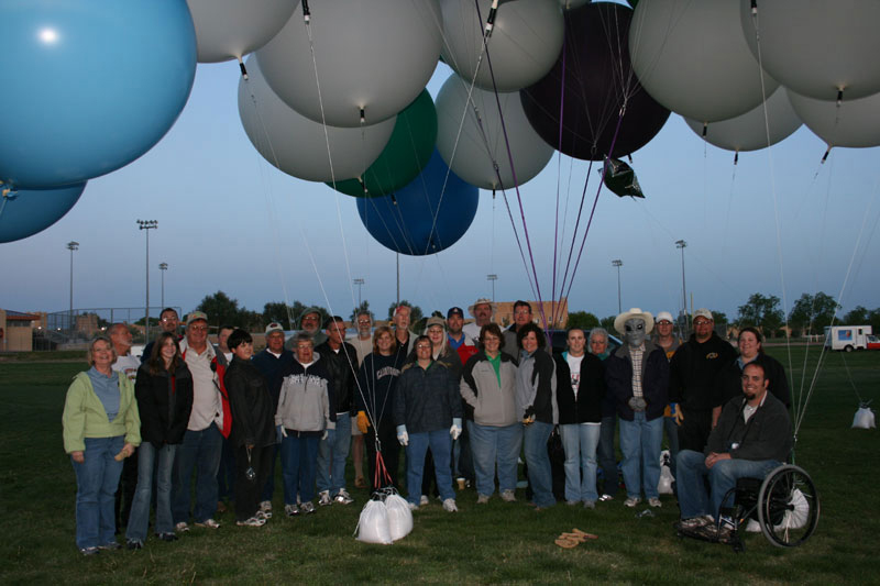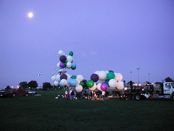 The weekend of the Old Timer's Balloon arrived. A large group of friends and acquaintances showed up on the soccer field at the New Mexico Military Institute ("The West Point of the West") to help old Andy relive the rituals of his native land, or possibly kill himself in the process. Not that I think anyone wished me ill -- but it's a small town, and people hate to miss out on anything interesting. The moon was still bright in the night sky when we met at 4 AM. Jennifer Youngblood and Rocky Rodriguez over at our local Airgas store had collaborated with Bill's balloon rally group to provide the helium gas for me. I was a bit nervous as we inflated the spare flotation pods salvaged from my crashed ship so many years ago, but they were all still in good shape. |