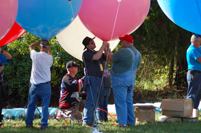 I was scheduled to fly Saturday afternoon. It was still a bit windy at 2:30 PM, when my inflation was due to start, but we had anticipated that and had set my helium tanks in the lee of a grove of trees. At the appointed time, exactly one volunteer was there, but some frantic calling to the festival organizers eventually yielded enough people to do the inflation. |