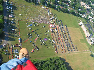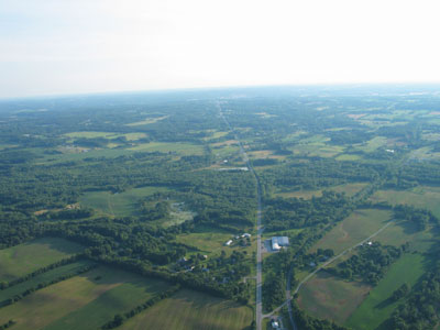 Down on the launch field, the other pilots were laying out their hot-air balloons and inflating them. The huge balloons shrank to tiny, colorful baubles as I continued to rise over the town. Still climbing, I drifted slowly to the southwest, out of Ashland and over the Ohio countryside, until I had floated up to almost 4,000 feet. |