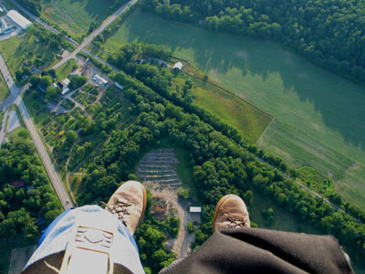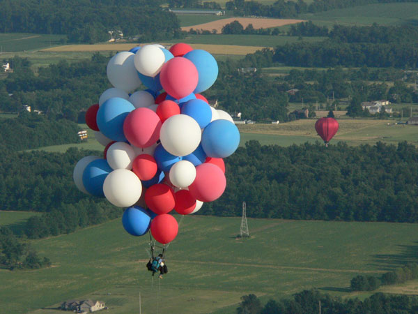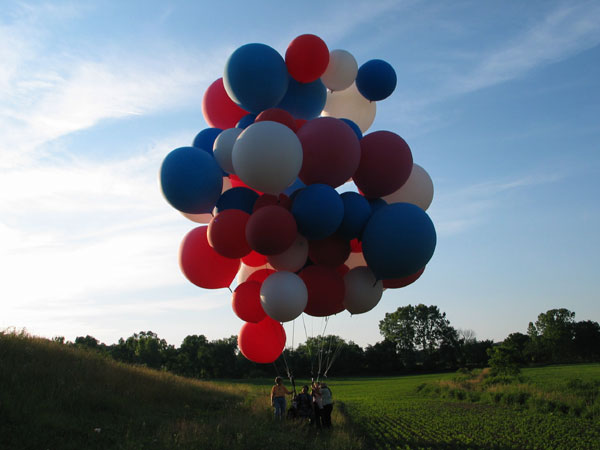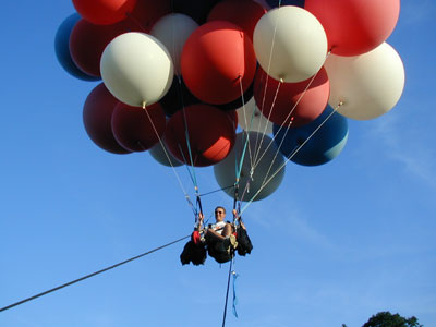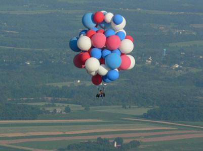 It seemed very fitting for to me to fly in an event that once celebrated toy balloons, in a place that was the world's leading toy balloon producer. Today, the notion of America as the world's leading supplier of any kind of low-tech manufactured goods is a bizarre, timewarp kind of idea, although one that holds a certain nostalgia in Ohio. For my own part, I must admit that my project to float over the 50 states involves balloons imported from overseas -- the sizes that I need to fly are no longer produced in the United States. Perhaps someday the people of the developing world will begin to devote all their time to daytrading and selling real estate to one another, at which point the Balloon Queen will return balloon manufacturing to its rightful place in Ohio. In the meantime, if Americans no longer make the world's supply of toy balloons, at least we can make creative use of them. That day, when I rose into the clear summer sky with my wonderful balloon bouquet, it's nice to think that perhaps, for a moment, we made Ashland the Balloon Center of the World once more. |