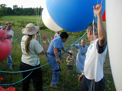 The people whose property we had landed on were very nice, and did not seem too troubled by our arrival. Phil had a chance to go up on tether; I'm not sure if this satisfied his curiosity about cluster ballooning, or merely contributed to some impending delinquency. We began deflating the balloons. Some neighbors came by to watch and were drafted to assist us, receiving a large balloon or two by way of thanks. |