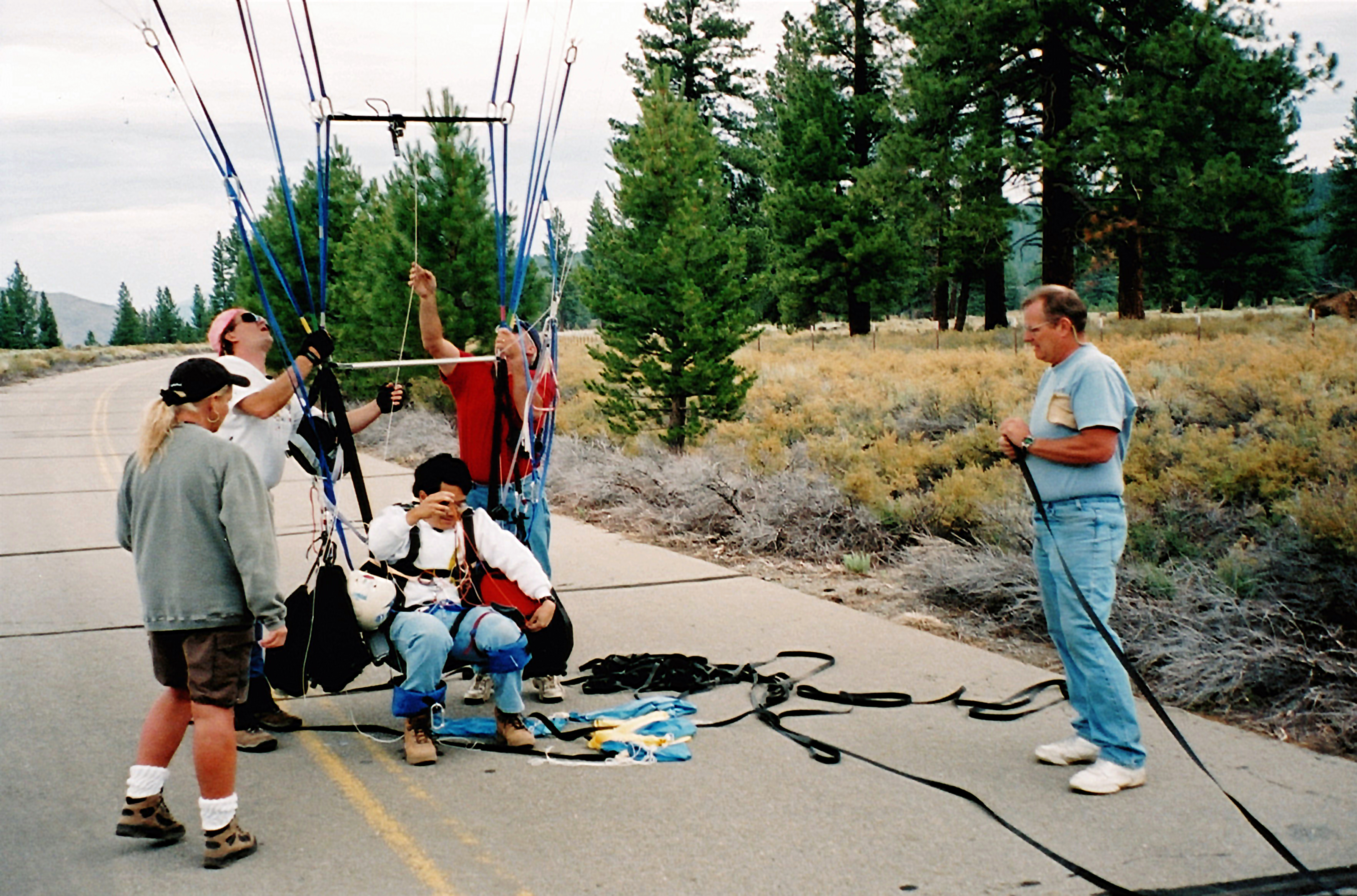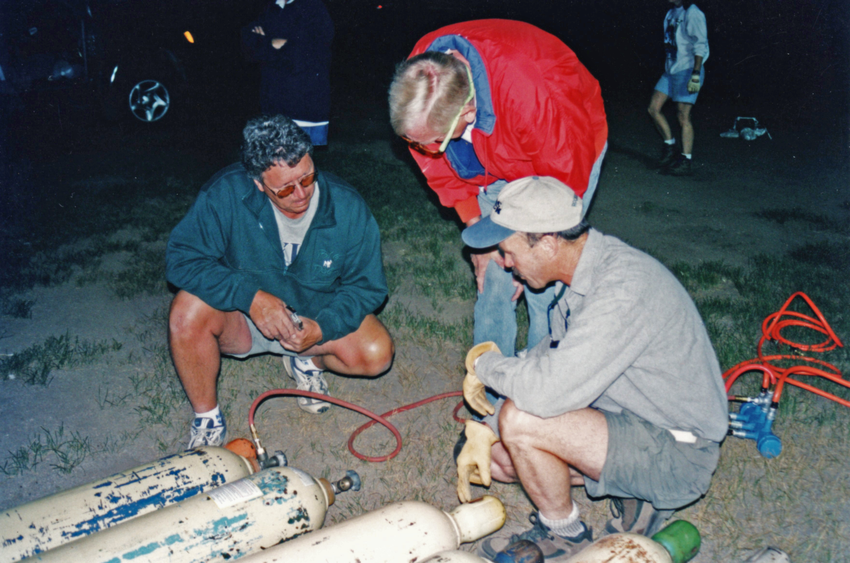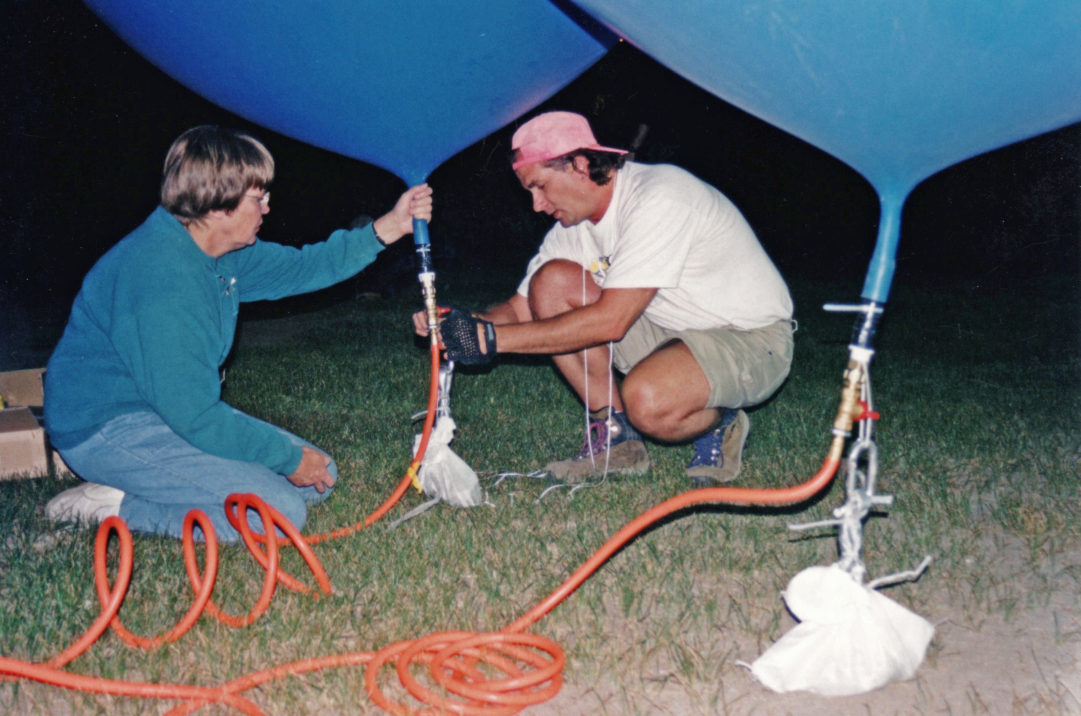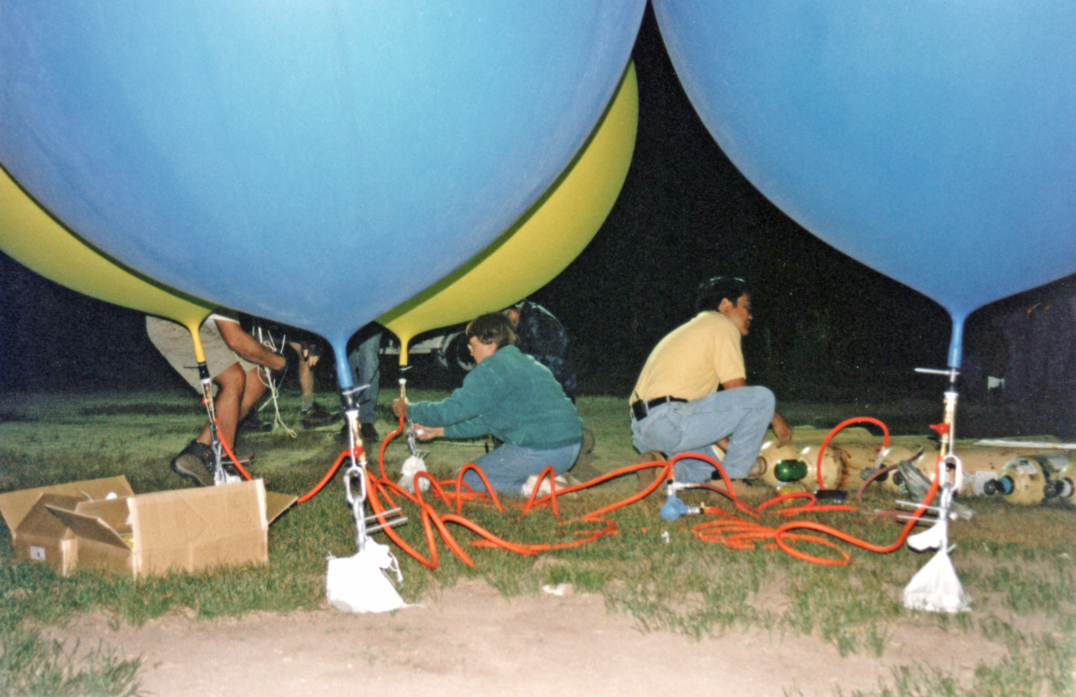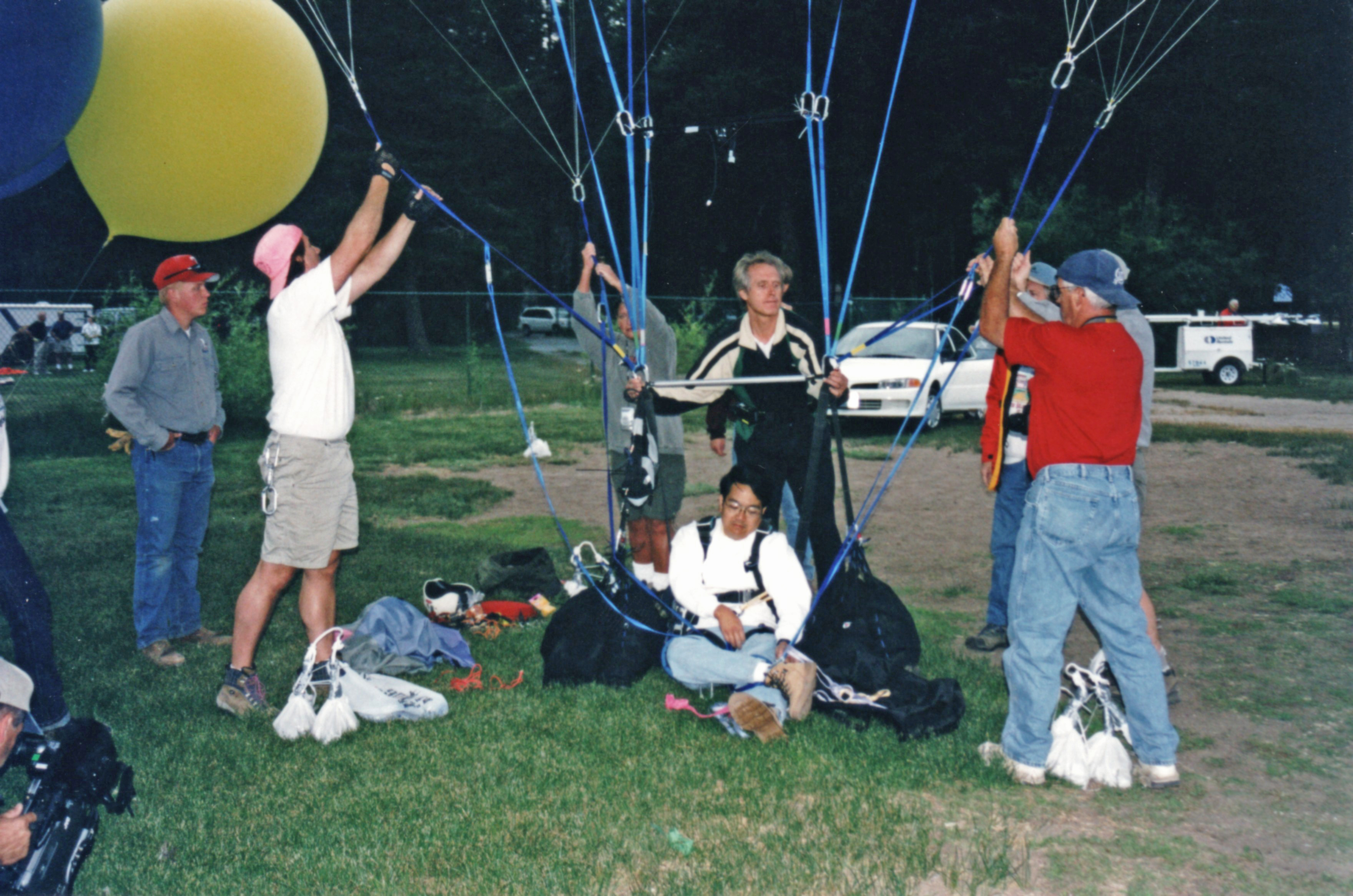 Ernie Hartt, Jenny Wolf and Jerry Sebby joined me from San Diego. My friend, local balloonist Ray Shady, was recruited to follow me with a cameraman in his hot-air balloon. Two other balloonists, Stan Robertson and Don Morgan, advised me on local conditions, and volunteered to bring a number of other crew to assist with the inflation. |