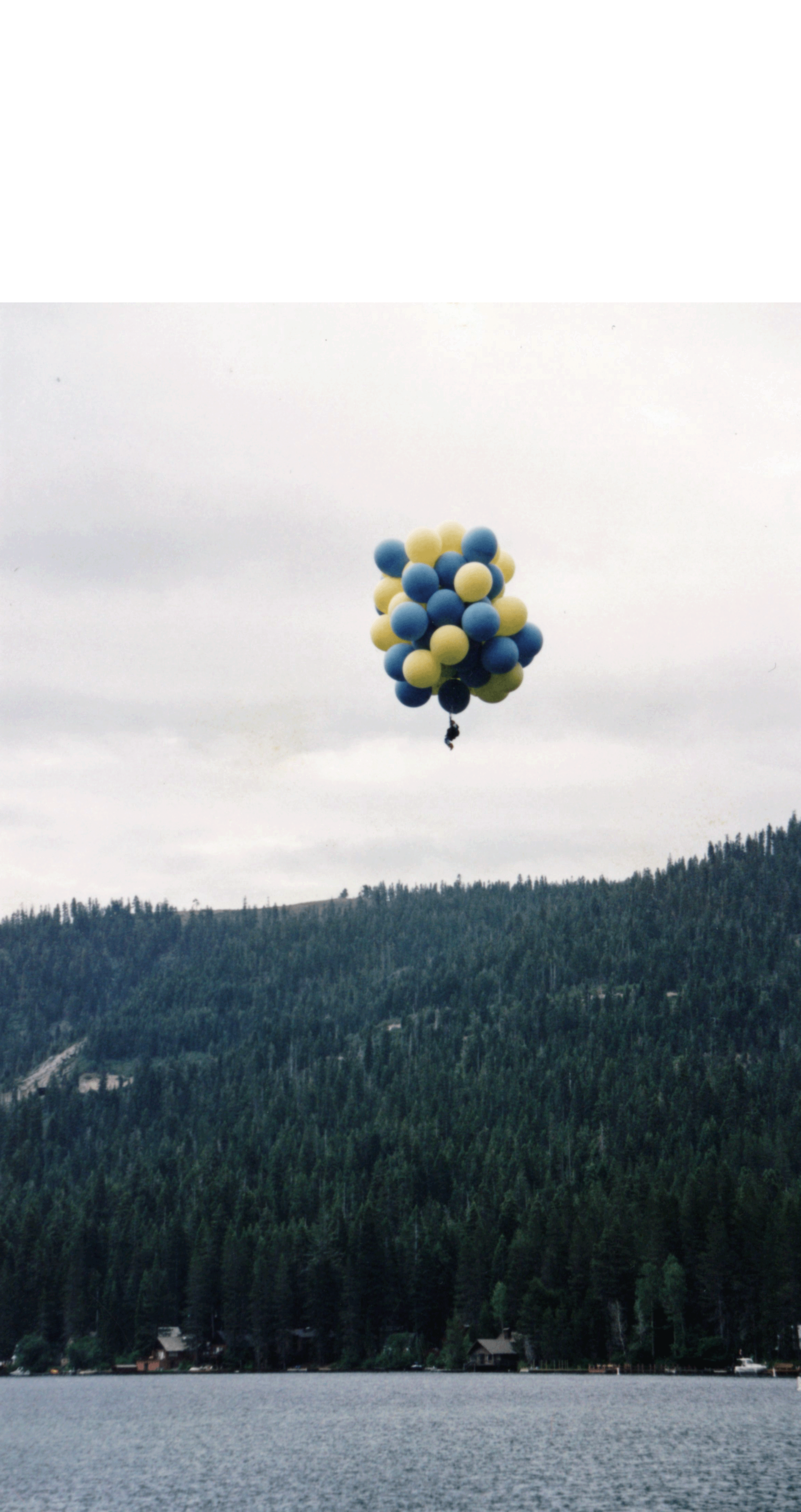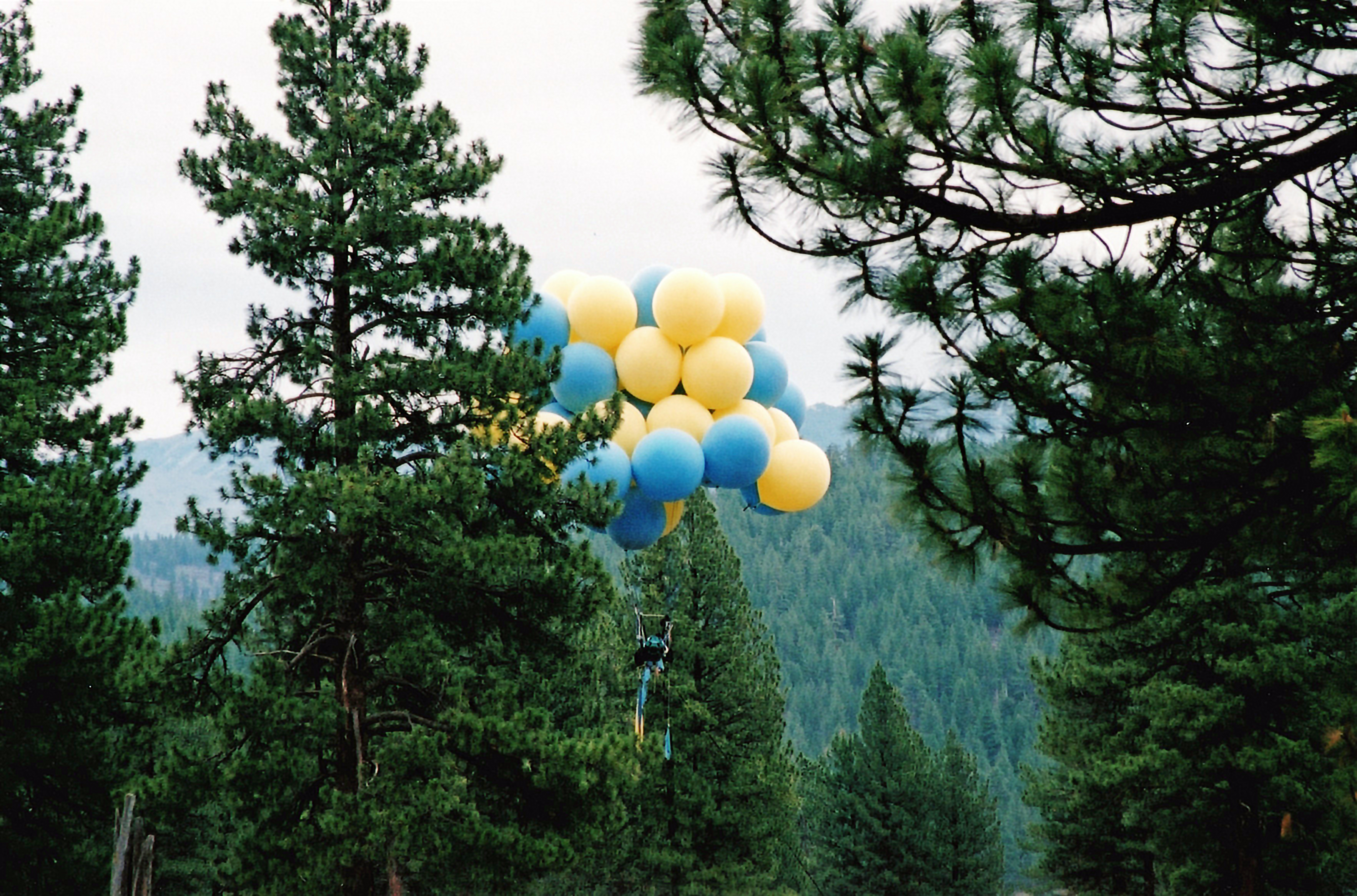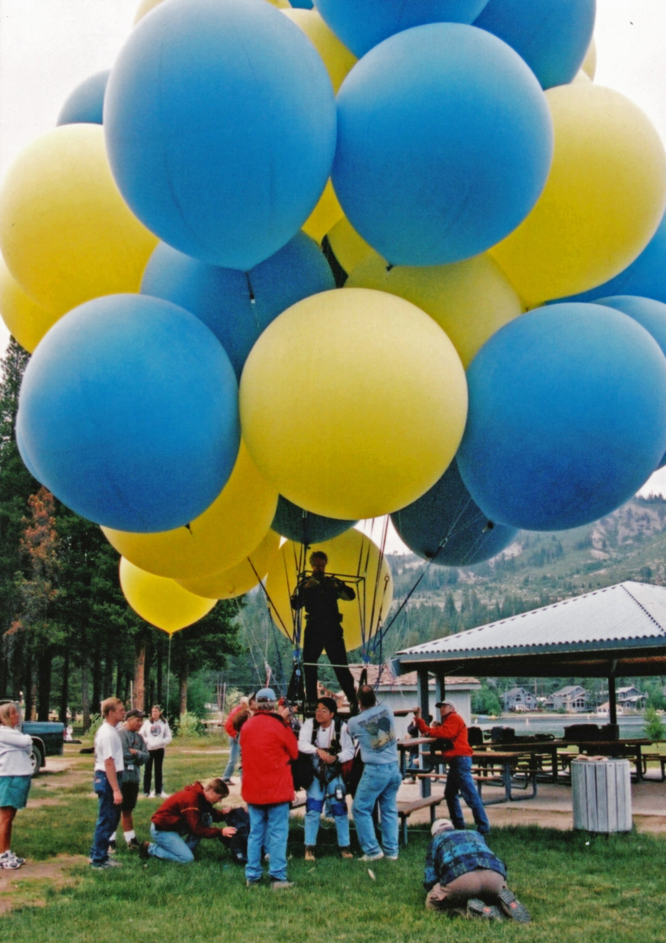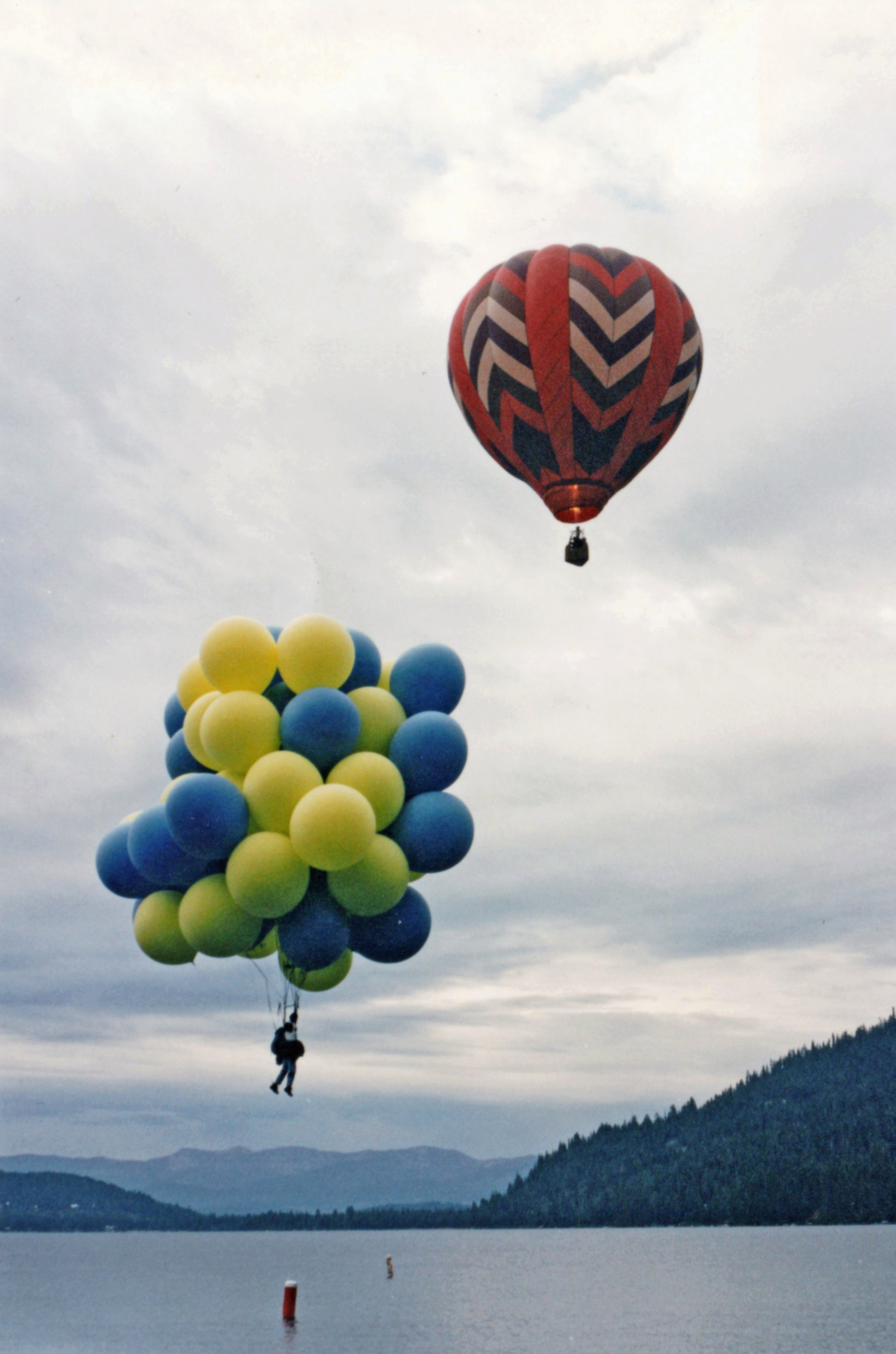 Someday I hope to fly from Donner Lake again, on a clear sunny day with no wind on the ground and brisk winds aloft to take me over the mountains to a nice landing spot north of Reno. However, I'll never forget my first flight in the mountains: that moment standing at the edge of the lake, the blood shaking my heart, my sixty-four blue and yellow balloons bouncing and straining in the breeze, ready to sweep me off into the windy grey sky. |