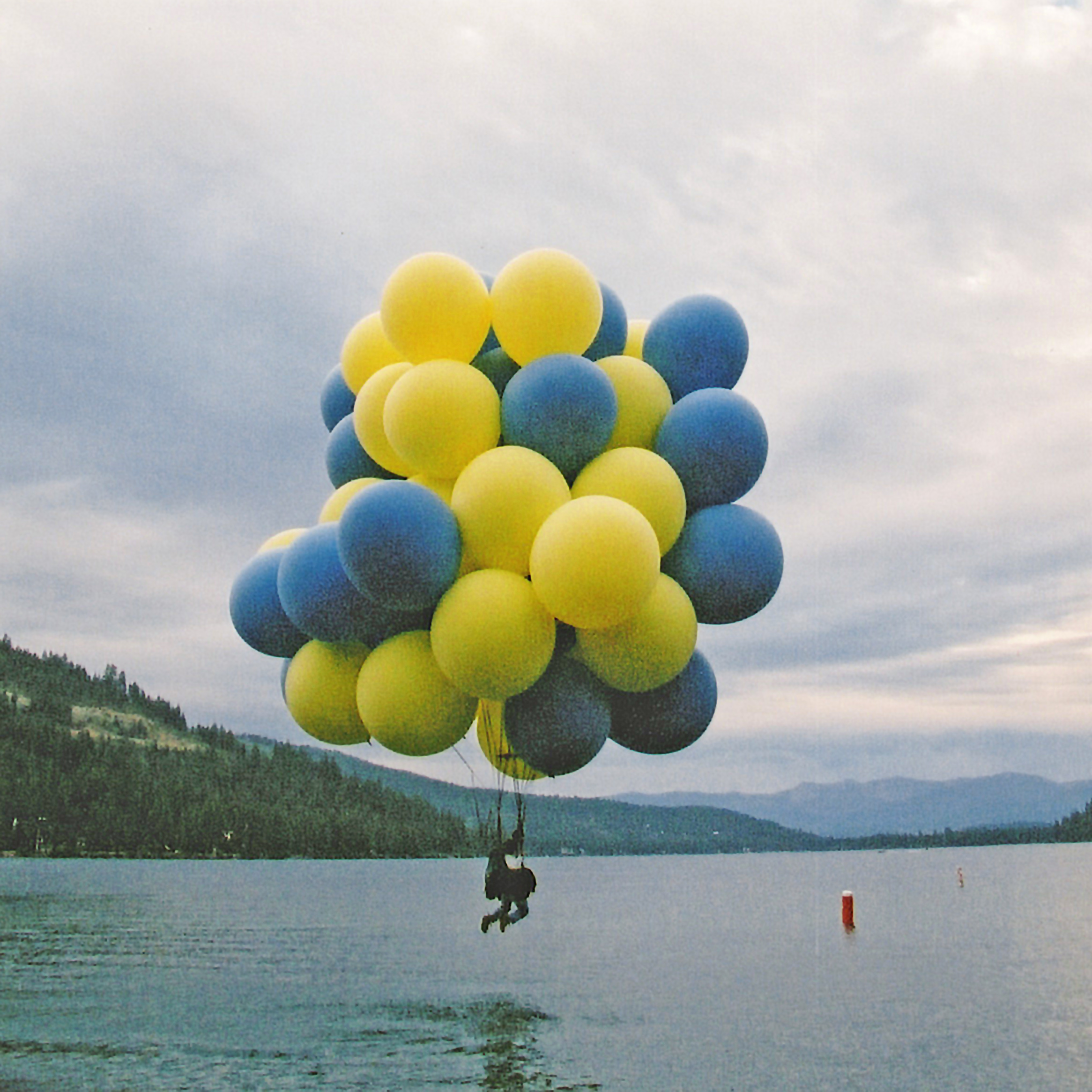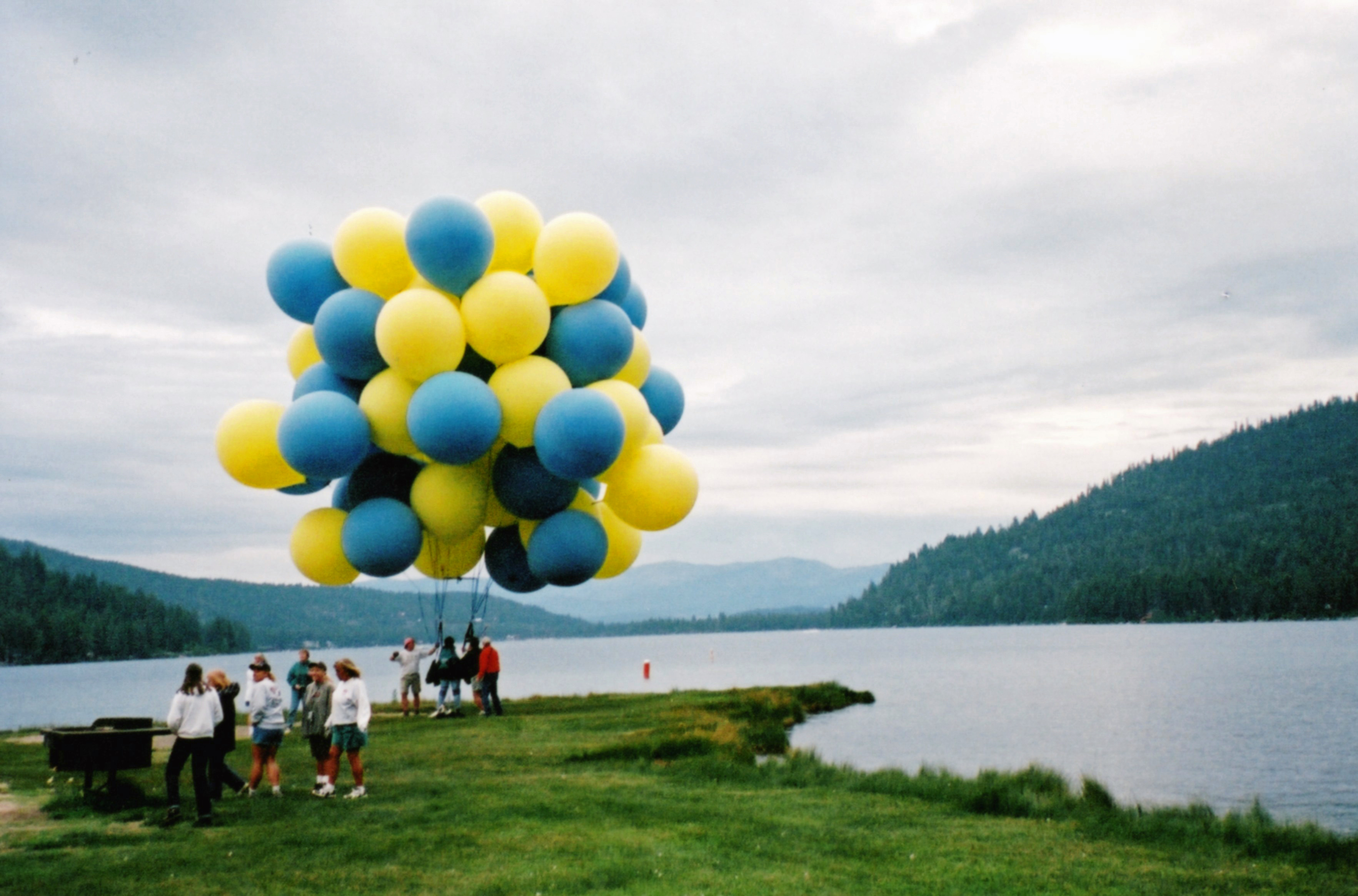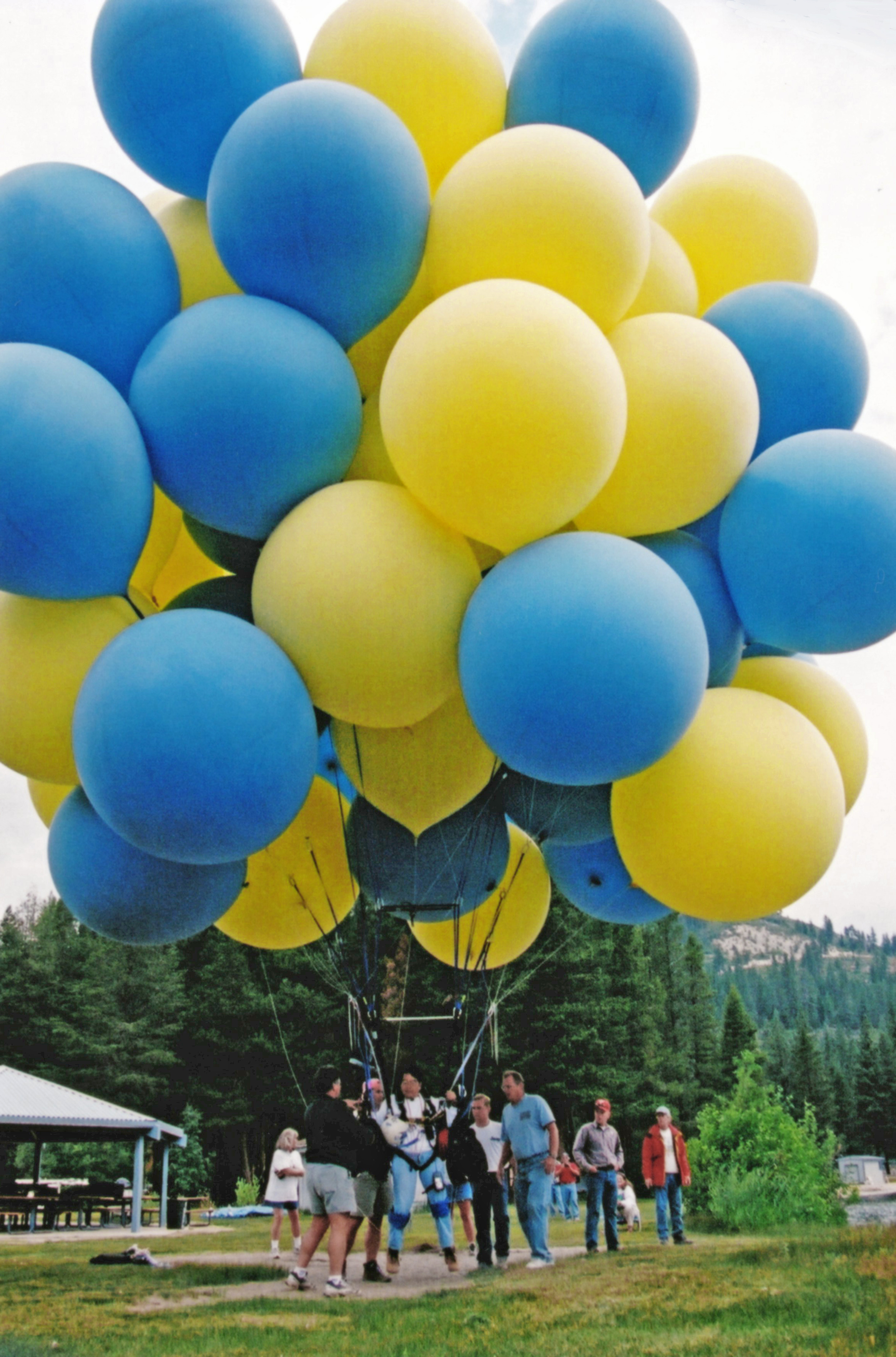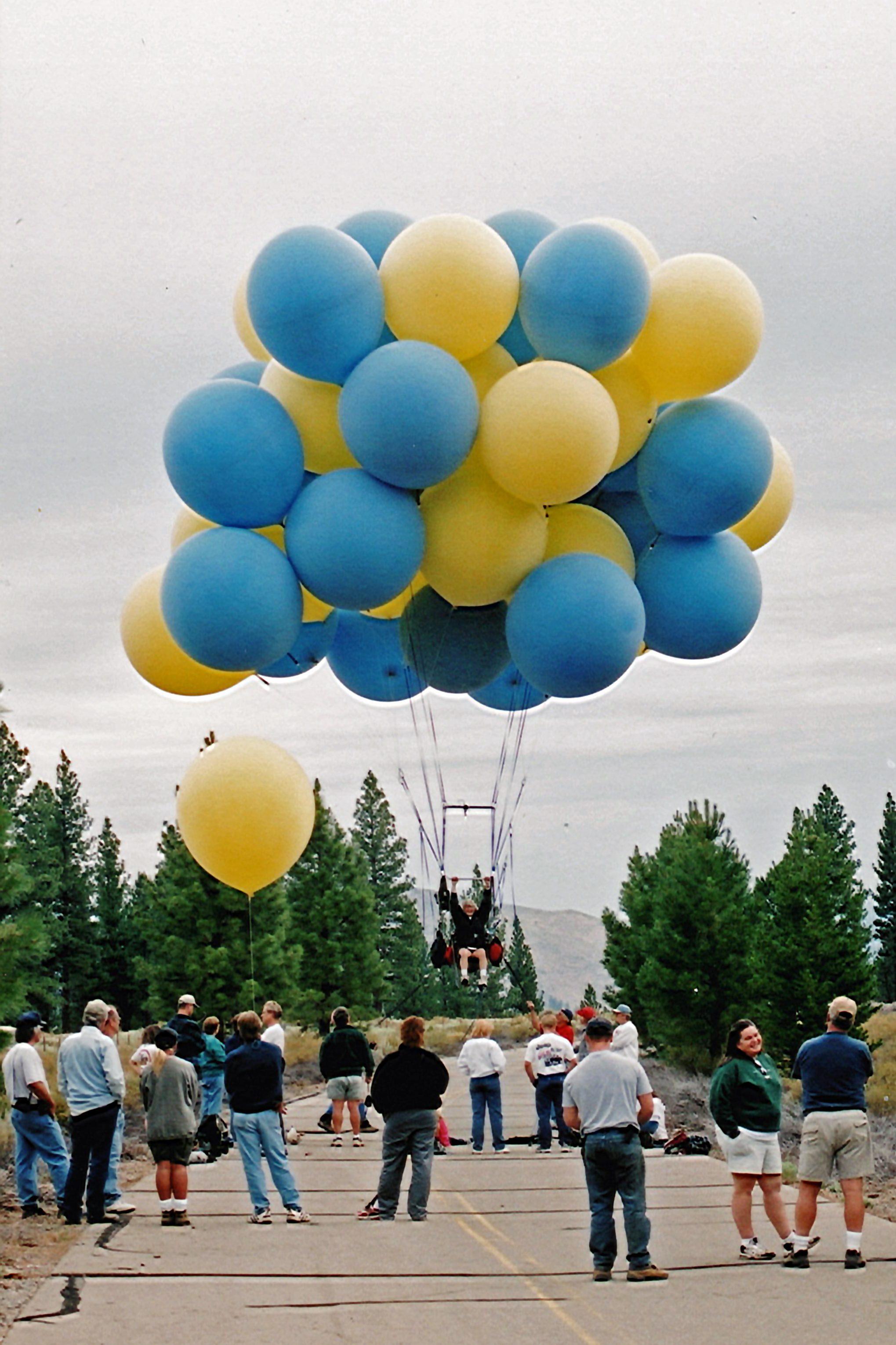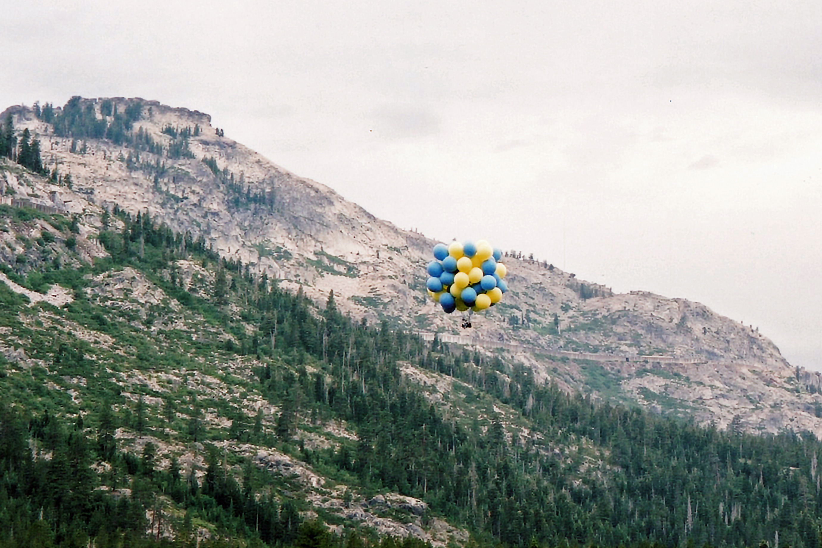 Someday I hope to fly from Donner Lake again, on a clear sunny day with no wind on the ground and brisk winds aloft to take me over the mountains to a nice landing spot north of Reno. However, I'll never forget my first flight in the mountains: that moment standing at the edge of the lake, the blood shaking my heart, my sixty-four blue and yellow balloons bouncing and straining in the breeze, ready to sweep me off into the windy grey sky. |