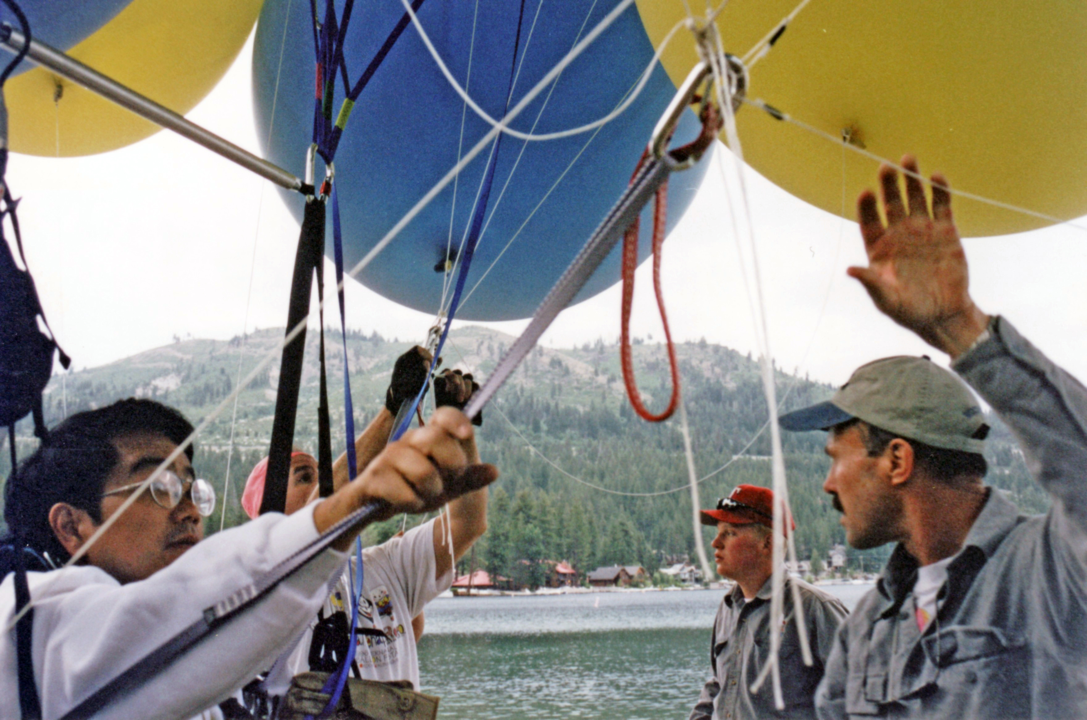 In July 2001 I had an opportunity to go cluster ballooning with the sponsorship of the AIMS Education Foundation, to appear in a video they were developing to teach children about the math and science concepts involved in ballooning. Because they wanted a scenic flying location for their video, I suggested that we fly from Donner Lake, in the Sierra Nevada mountains north of Lake Tahoe. |