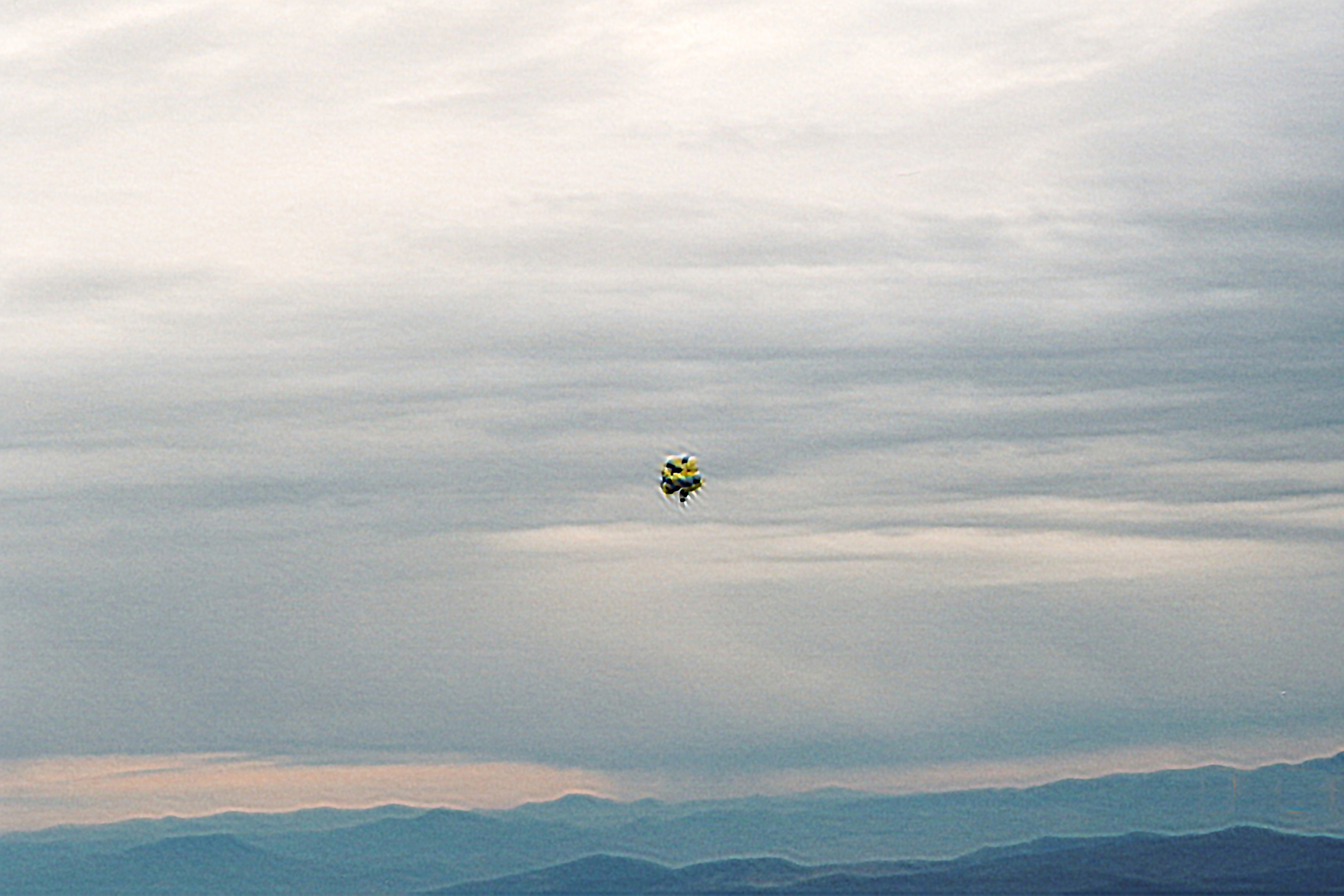 The mountains were awesome: huge and dark green with trees under the grey sky. I kept ascending, until I was about a mile above the ground. |