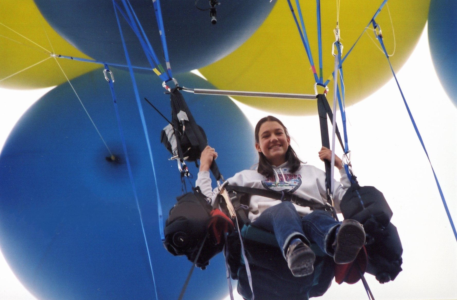 At dawn, I got into my harness and the crew began attaching balloons to me. |