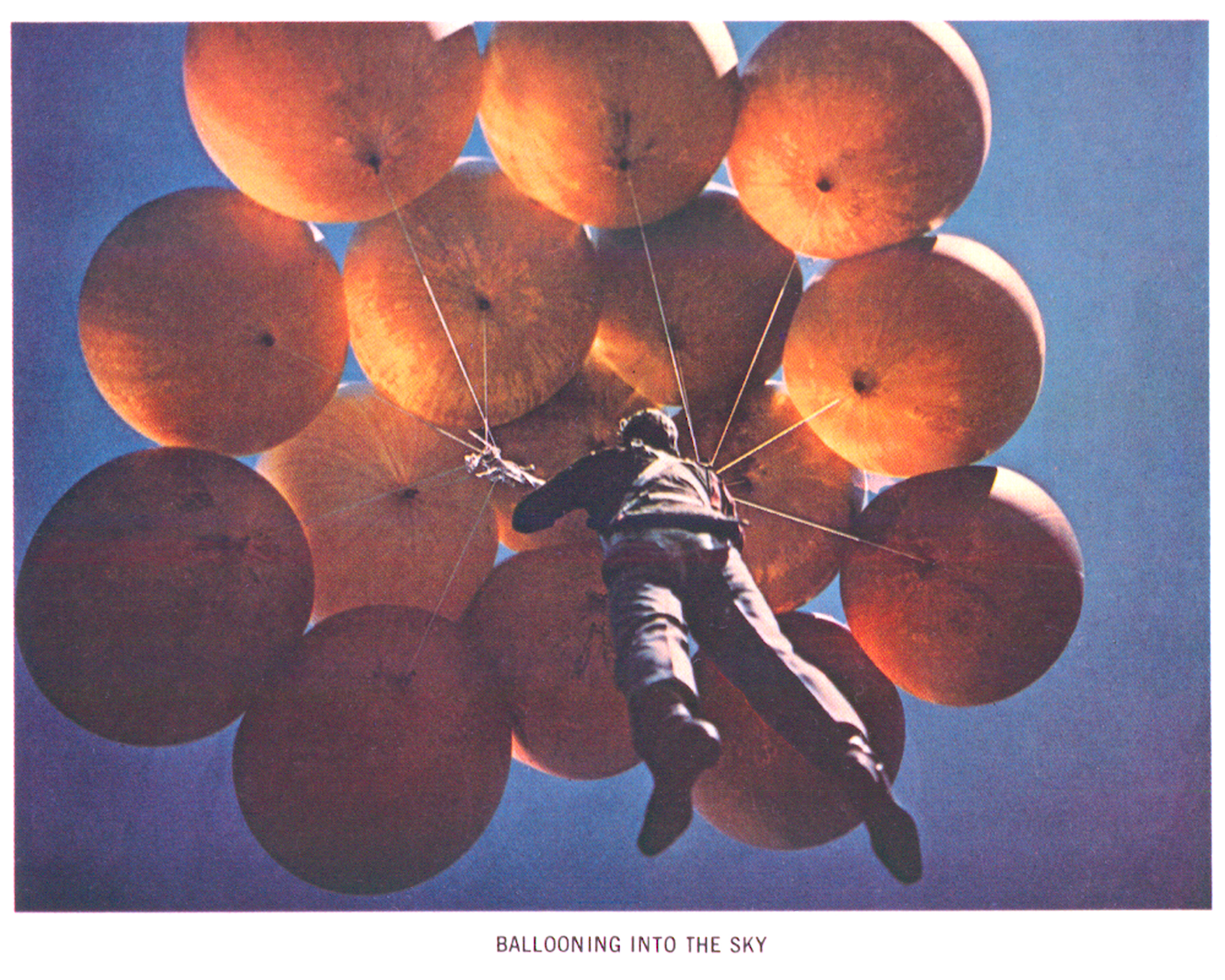 With four of the balloons attached, I was nearly weightless. I made some huge 10-foot jumps, landing lightly on my feet.