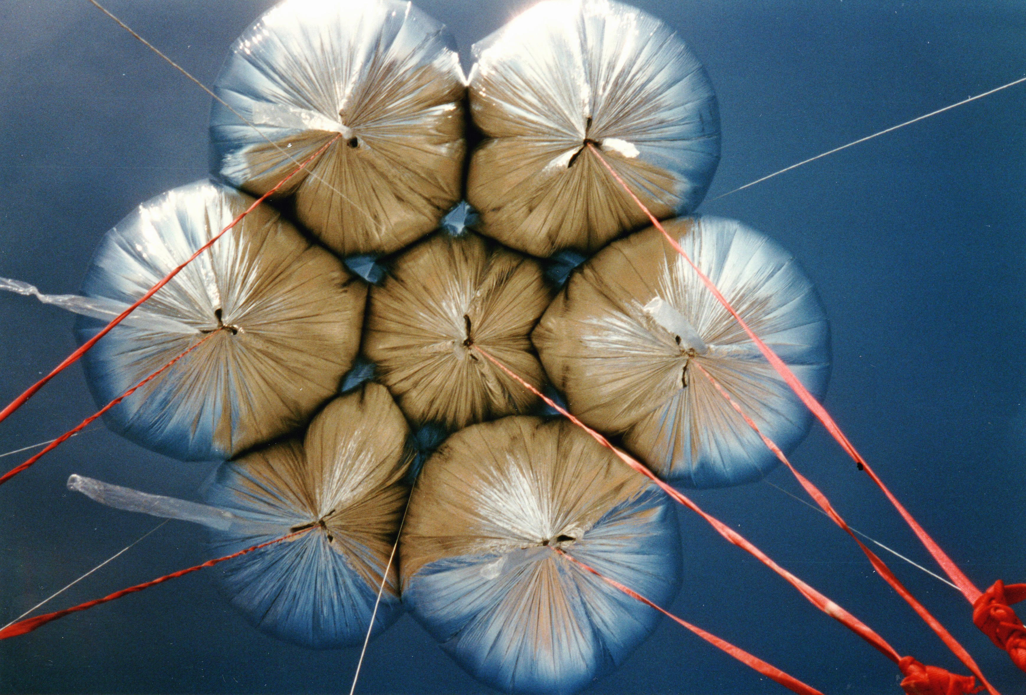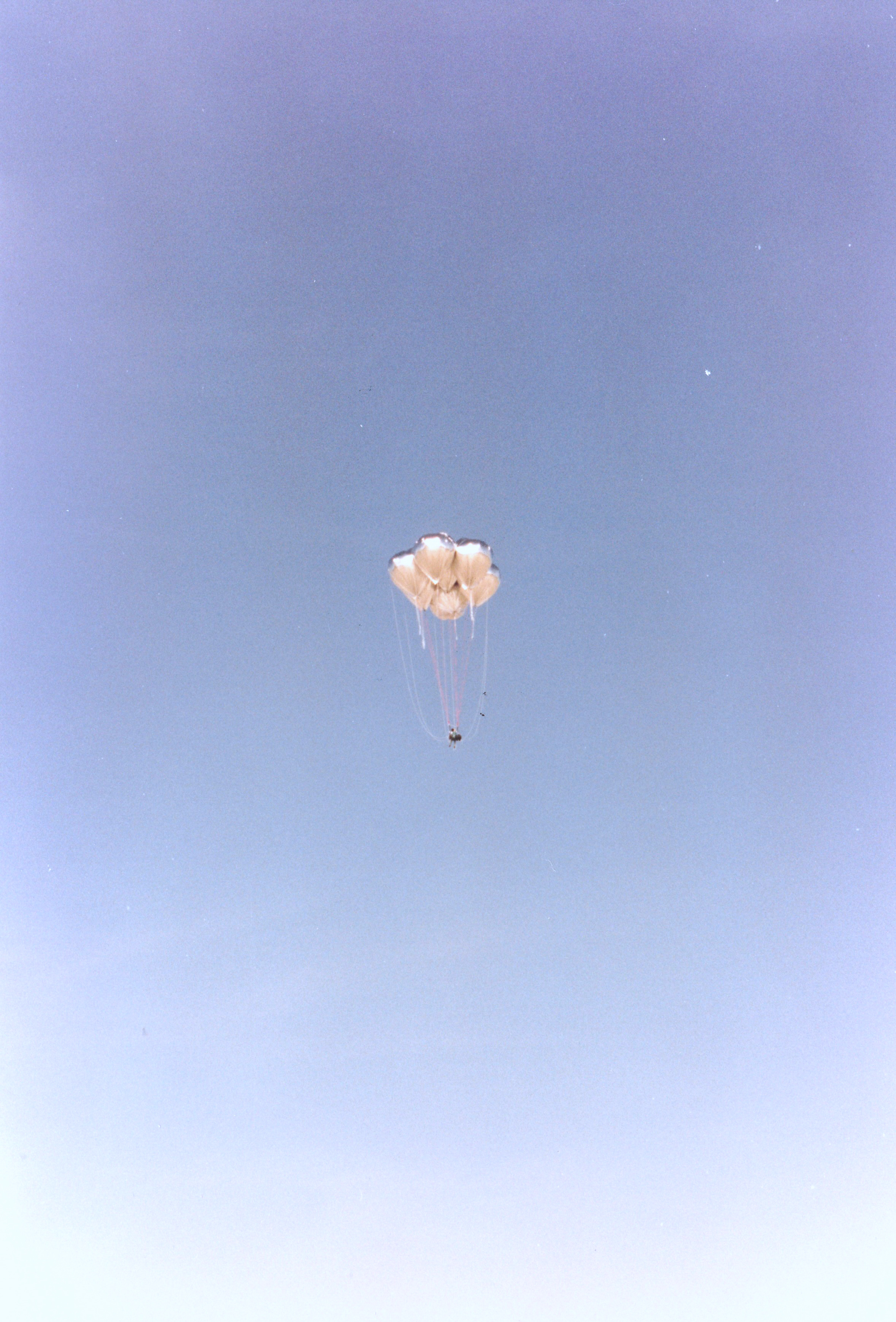 The balloons were designed to be controlled by lines that ran up to the tops of the balloons. Pulling one of these lines would cause the balloon to tip, which would cause helium to spill out of the openings at the bottom. I tried it now, uncomfortably aware that if this did not work I was in for a very long flight. But the balloon tipped, the little vent openings at the bottom of the balloon widened slightly, and my rate of climb dropped slowly from 100 feet per minute up to fifty feet per minute down.