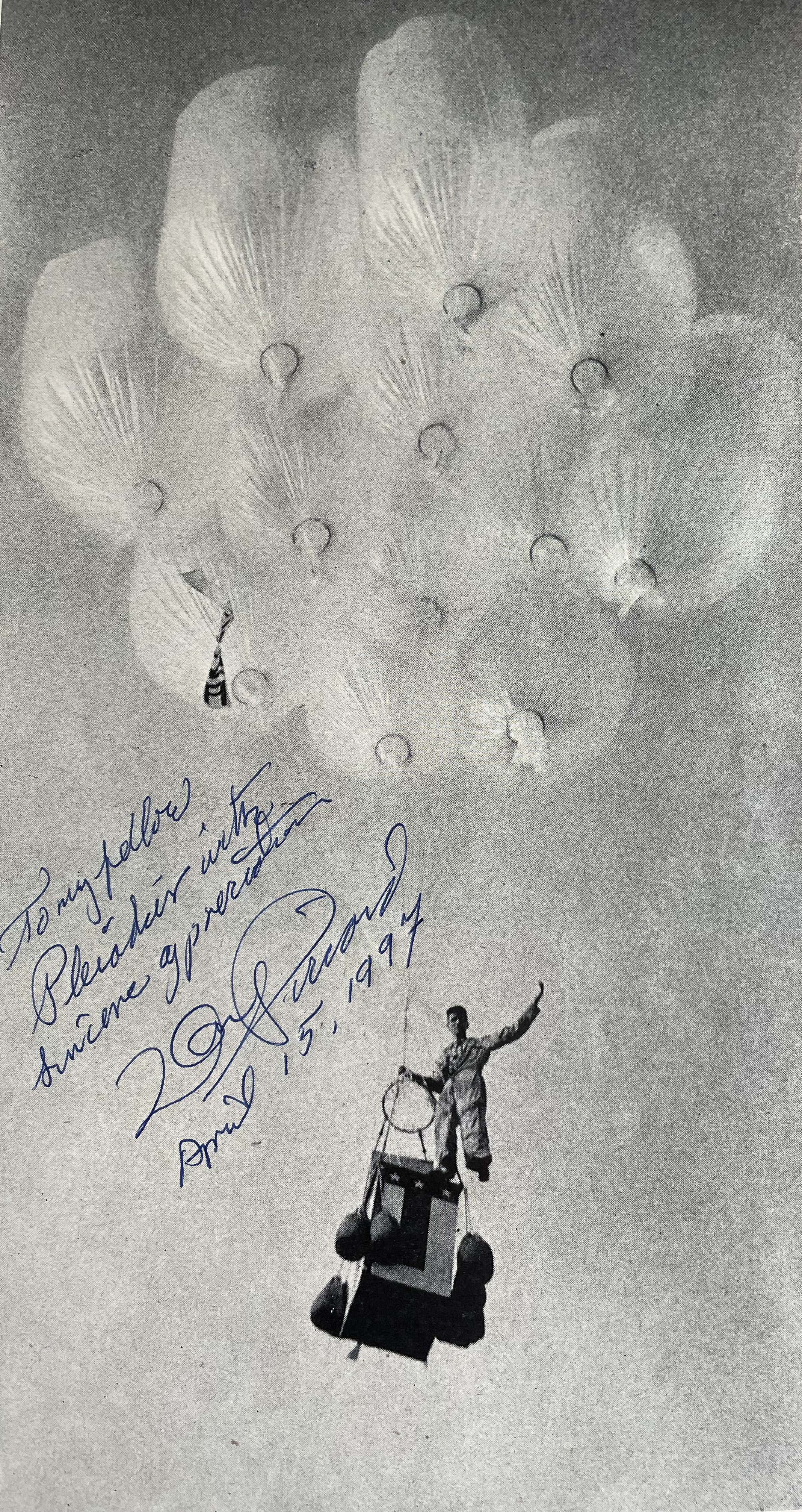 Don Piccard was one of the pioneers of modern hot-air ballooning, as a pilot, engineer, and early manufacturer. Don was also very experienced with gas balloons and had done some flights in the with clusters of helium-filled plastic balloons in the 1950’s. He was semi-retired, at that point, but still active and, by reputation, something of a character. |