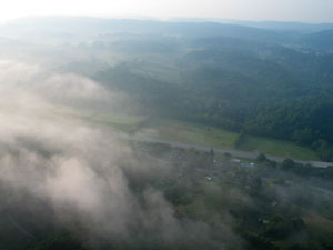 Finally, with no word on the radio from crew, I decided it was time to land. Out ahead of me, the country grew more hilly, and it looked like there were pockets of fog here and there -- not the kind of conditions I wanted for shooting a landing with all the powerlines around. I started to descend toward two open fields separated by a line of trees. As I dropped in, the wind speed dropped, so it looked like I would not clear the trees. However, I was low on ballast at this point, and rather than try drop ballast to go back up and shoot another landing, I just continued in and grabbed onto the top branches of one of the trees to stop myself. The balloons supported all but a few pounds of my weight, so I was able to stand up in the very highest branches and look around. |