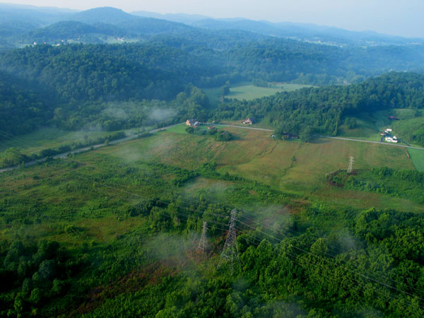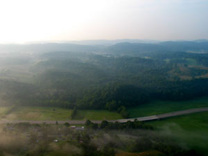 Wayne dropped back down low, where the winds were very light. That might have been the smart thing to do, but I didn't want to begin bursting balloons so early in the flight, and the haze hadn't really coalesced into fog. So I allowed myself to drift higher.I drifted south over the city and was soon headed right toward the Eastman chemical plant. I dropped some ballast to gain altitude and avoid going directly through the smoke plumes -- I am told that Eastman is in full compliance with all regulations regarding emissions from their smokestacks, and while I have no reason to doubt that, it seems unlikely that the standards were set with this precise situation in mind, so why take chances? Unfortunately, by ascending I had risen into a wind layer that was moving at about 20 mph to the south. I was also up high in the haze, where it would be hard for my chase crew could see me. |