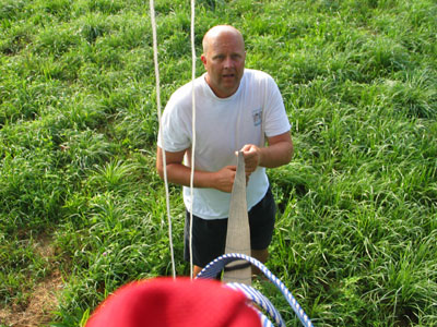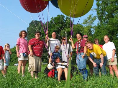 Happily, I saw someone walking up in the field below. It turned out that a couple of spectators at the launch had followed me in their cars from Kingsport. I called down and asked if they would lend me a hand. After making them go from one side of the trees to the other and them back again, based on the shifting winds, I pulled myself from tree-top to tree-top to where I could thrown down a line, which they used to pull me down to the field. I came down without bursting a single balloon. |