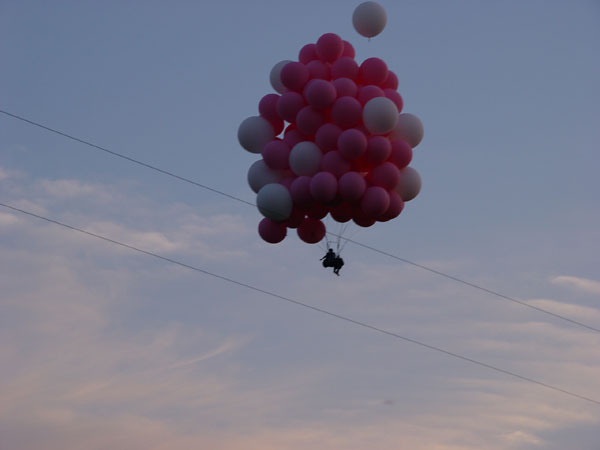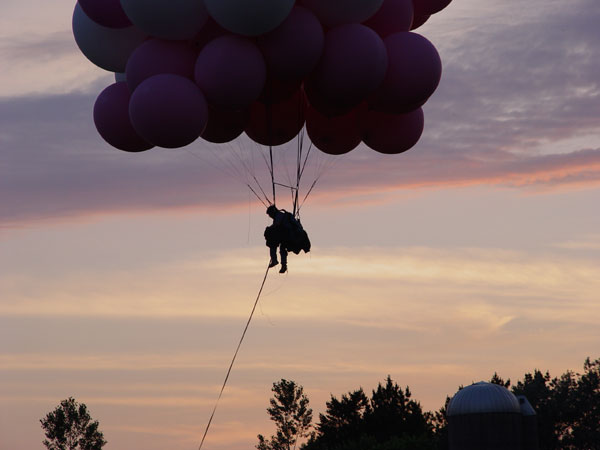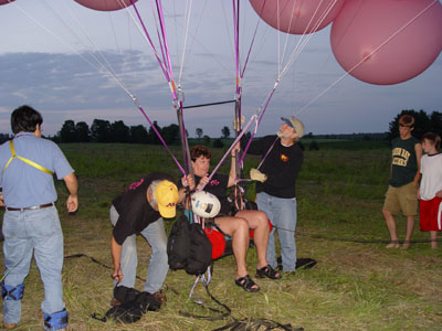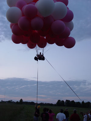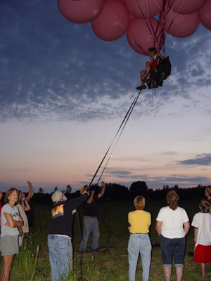Then, as the last light was fading and the fireflies were coming out, we put away all the balloons, and headed back toward Wausau. It had been a very long day. That morning it had looked like months of planning were going to result in just a brief hop across the airport, but at nightfall we were returning from a successful two-hour, twenty mile flight. I reflected that it might be nice to have a hobby that didn't depend so much on the weather. For that matter, beyond just weather, the success of one of my flights depends on everything from the interest of balloon festival organizers, to the punctuality of large numbers of volunteers, to the beneficence of the local FAA -- sometimes it seems remarkable thatI ever get into the air at all. However, I had to admit that the constant suspense about this or that factor ruining all my plans made the successes even more sweet. A balloonist's life is full of ups and downs. |
