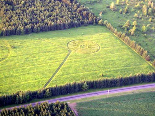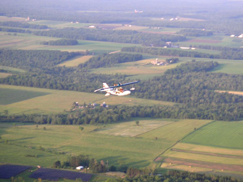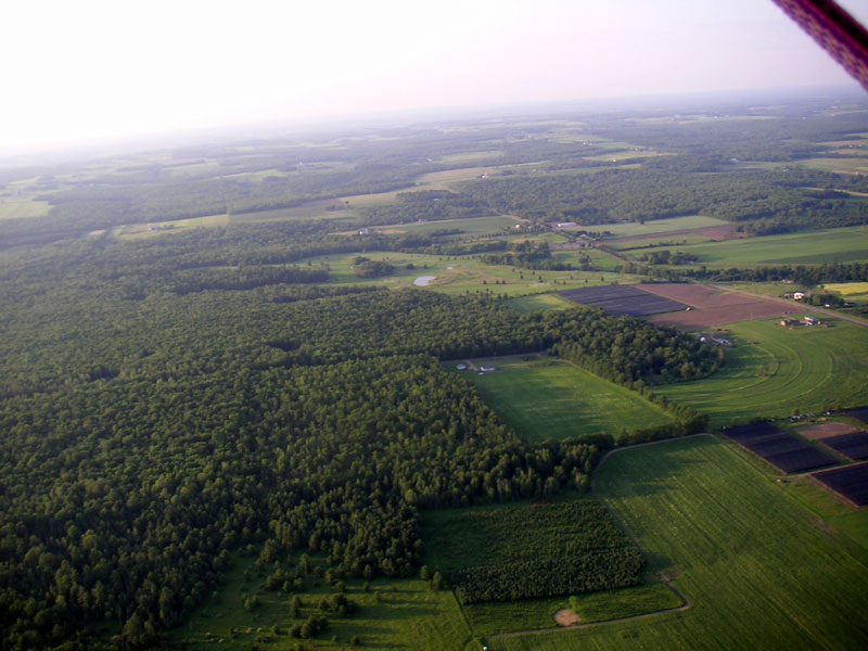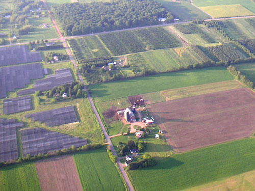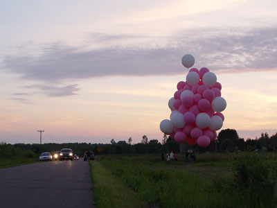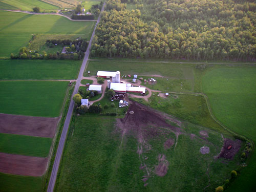 After two hours in the air, I had traveled about twenty miles north from the Wausau airport. The sun was getting low and the shadows were lengthening on the countryside below. My chase crew were criss-crossing their way to the north, making their way from road to road that crossed my path. I saw an open field out ahead, on the other side of an east-west road I would be crossing. Ernie told me that it was calm on the ground, although at about three-hundred feet my GPS still showed me as moving at 15 mph, an uncomforatble speed to be dragged around at. I released a balloon to start on my final descent. I sent crew out ahead, confusing them with some bad directions so they drove past the place I wanted them to turn. |