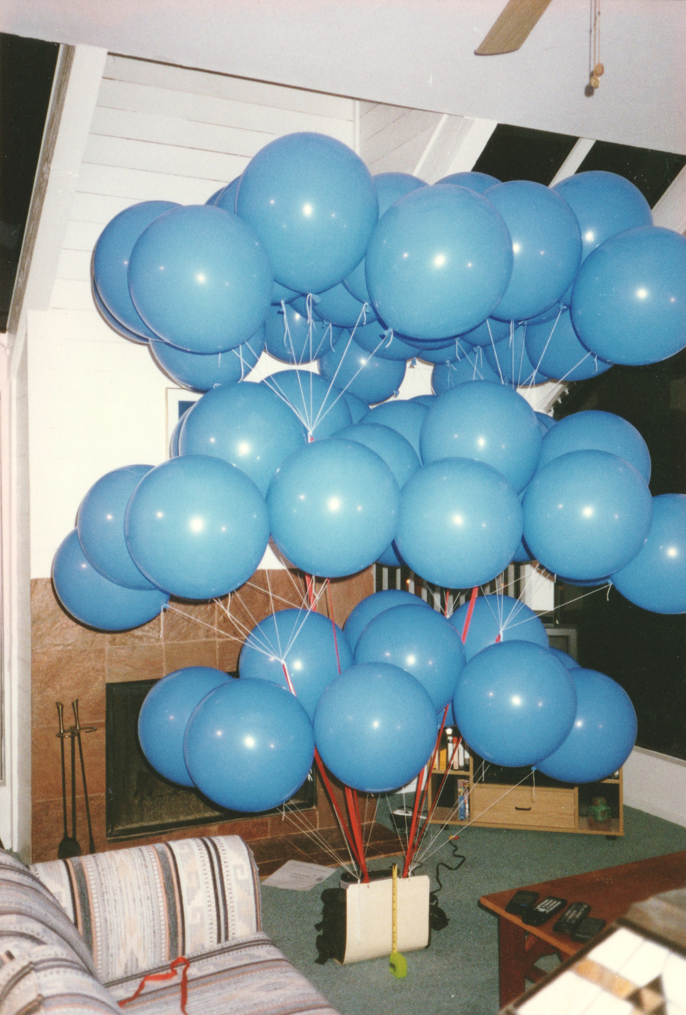 To prevent this, I devised a system of risers, webbing straps of varying lengths that would attach to my harness and hold groups of balloons at different heights above me to prevent tangles. Ernie and I built a one-fifth scale model of this system in my living room, based on 72 balloons held in three layers. The design seemed to work, as best I could tell. Brenda Theim, the seamstress from our local hot-air balloon repair station, sewed the actual straps for me.