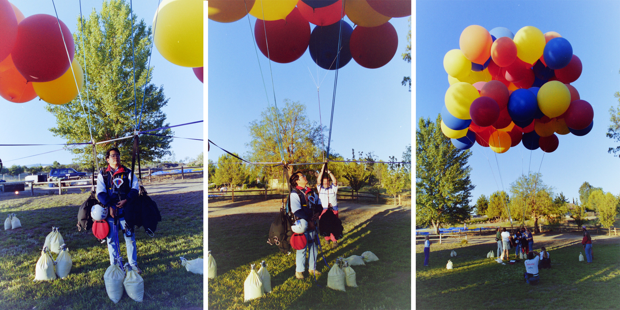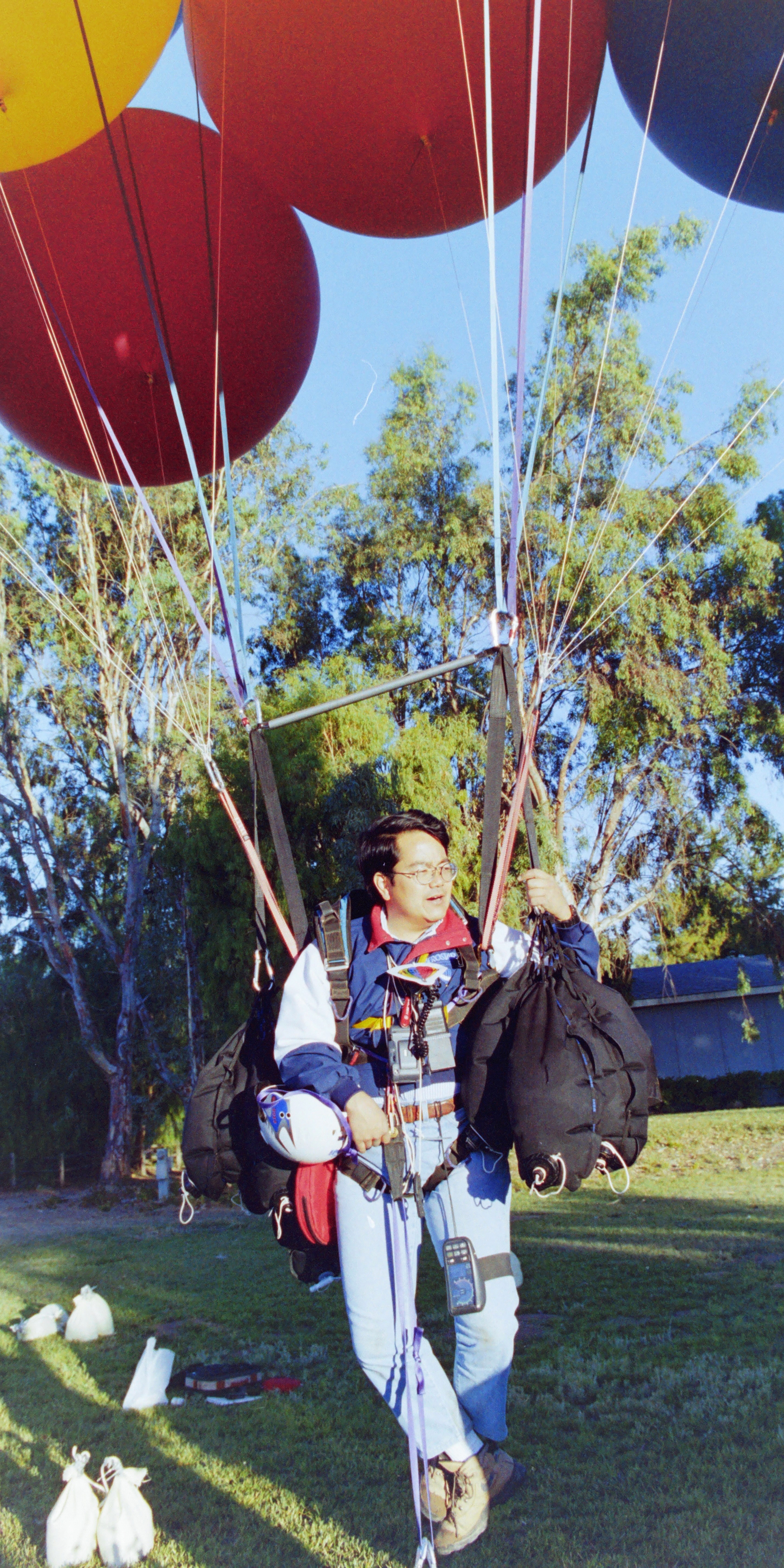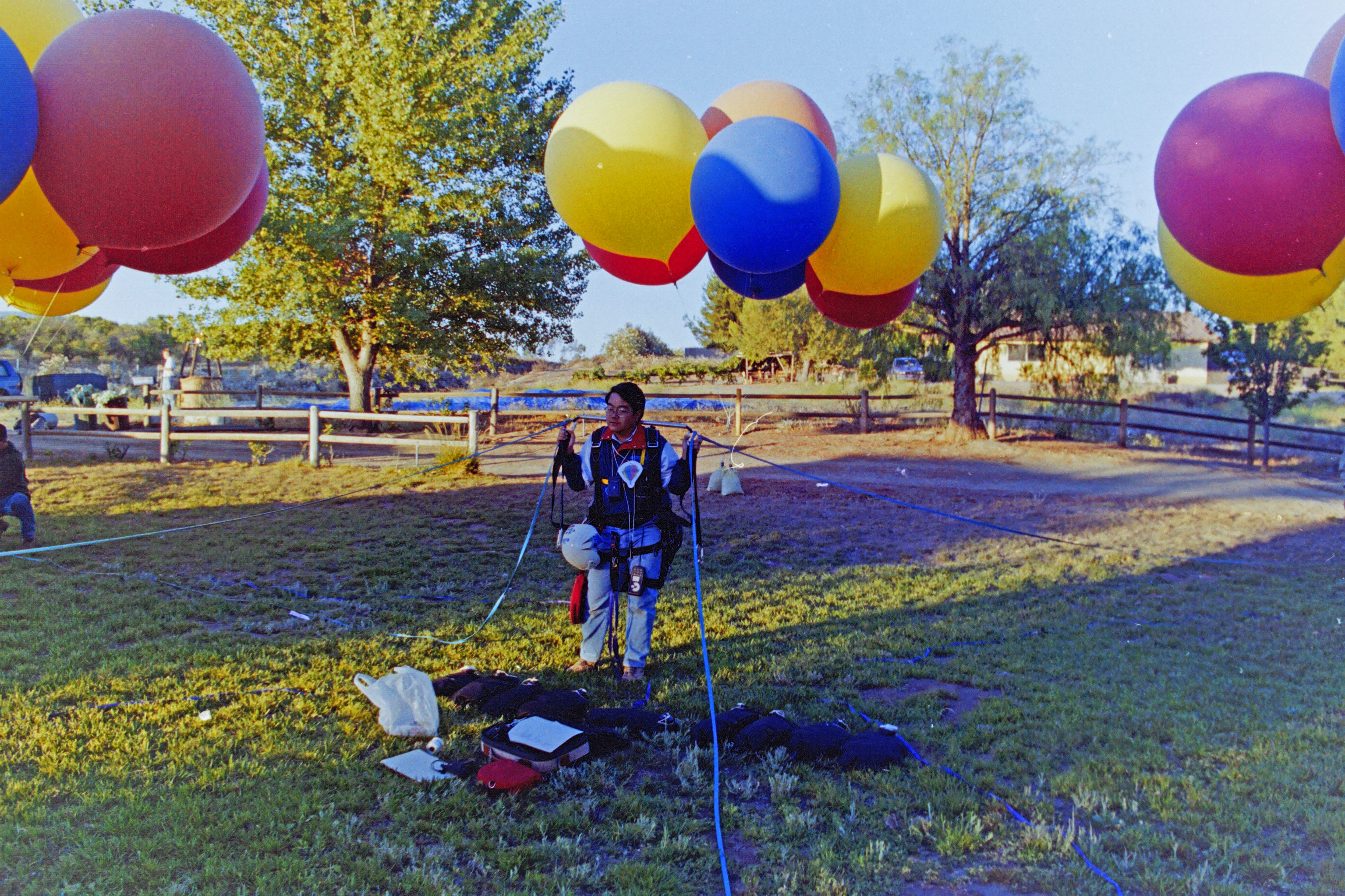 We laid out all my rigging and ballast bags. The webbing risers I had designed ran from my harness to the bunches of balloons attached to sandbags around the yard.