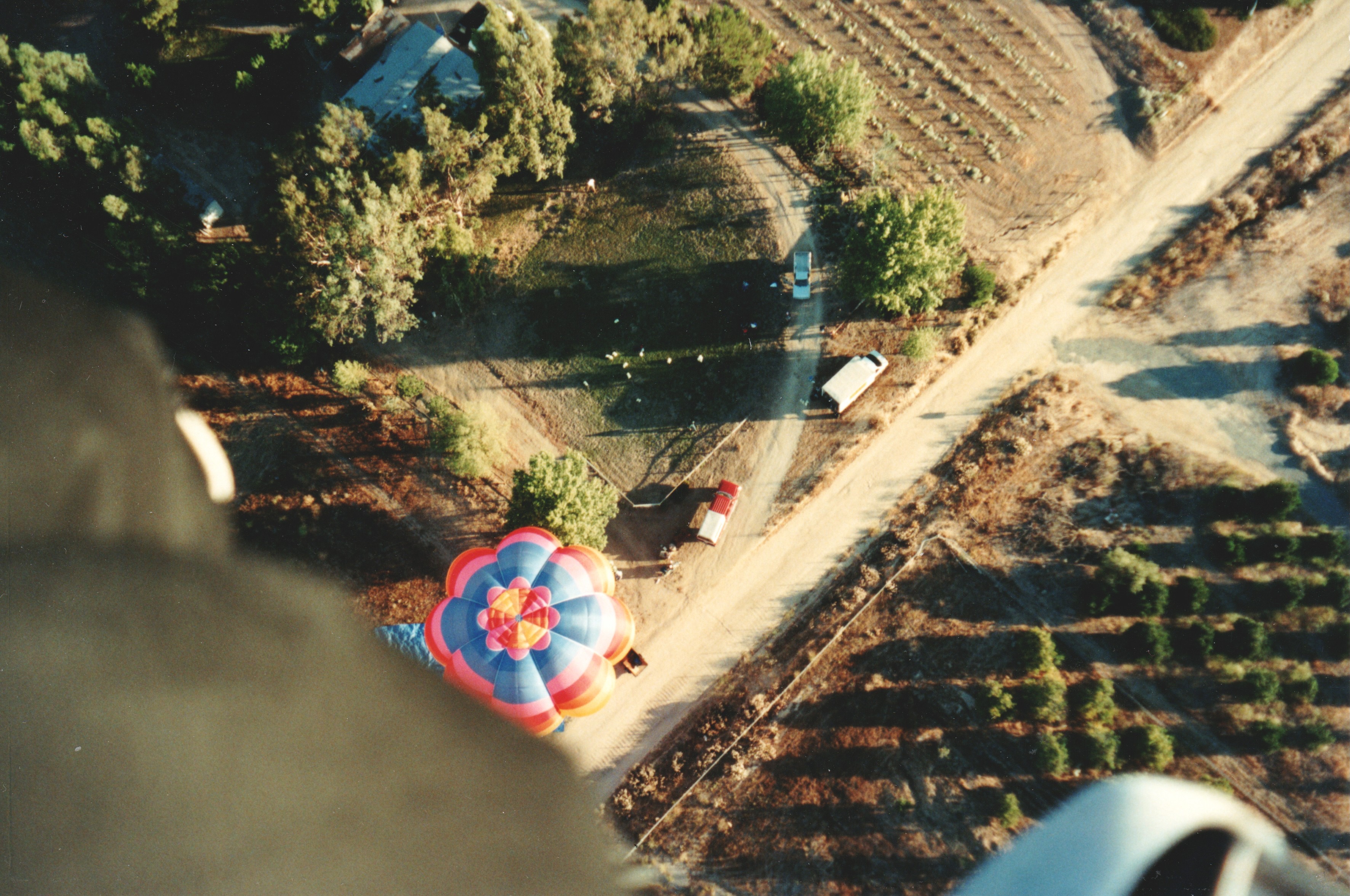 Swiftly and silently the balloons pulled me up into the sky. I could see the upturned faces of crew, Dean’s front yard, the surrounding fields and orchards dropping swiftly away. I waved until I could no longer hear the shouts and laughter of the crew. We had planned for Jenny to follow me in her hot-air balloon, but I was long gone before she lifted off.