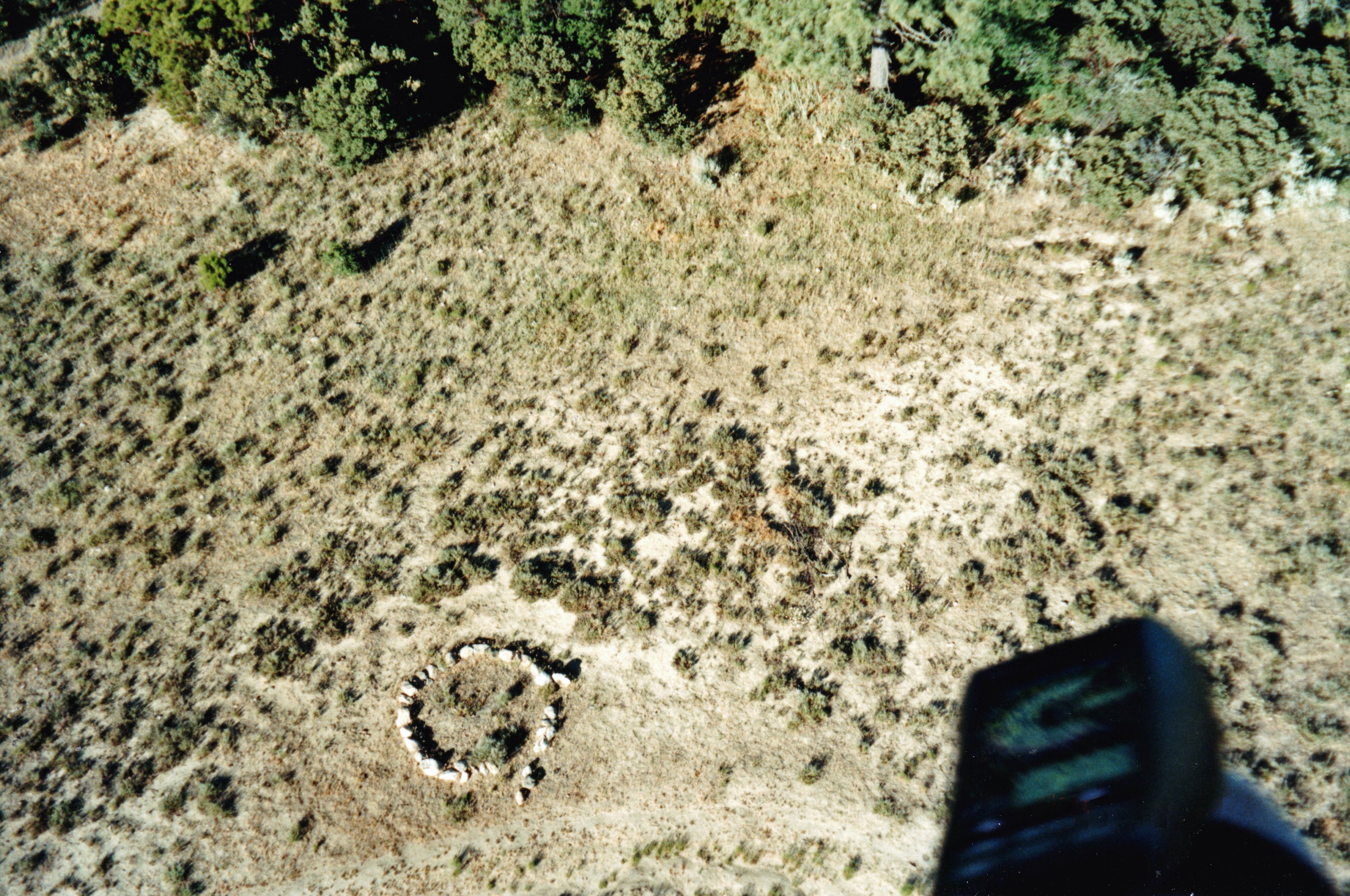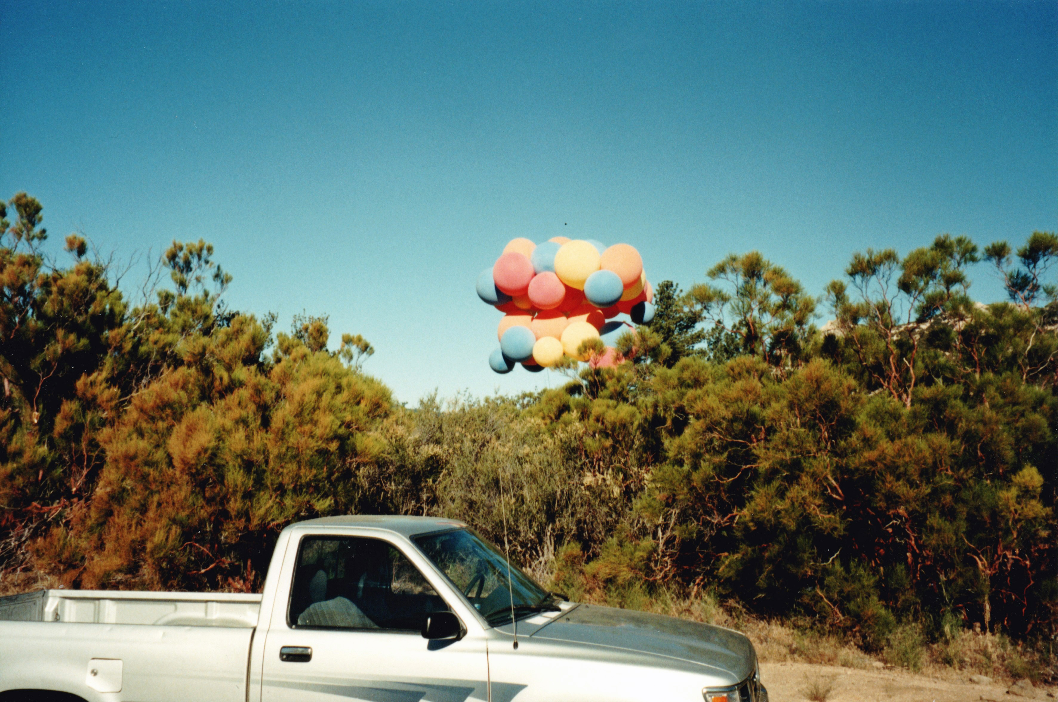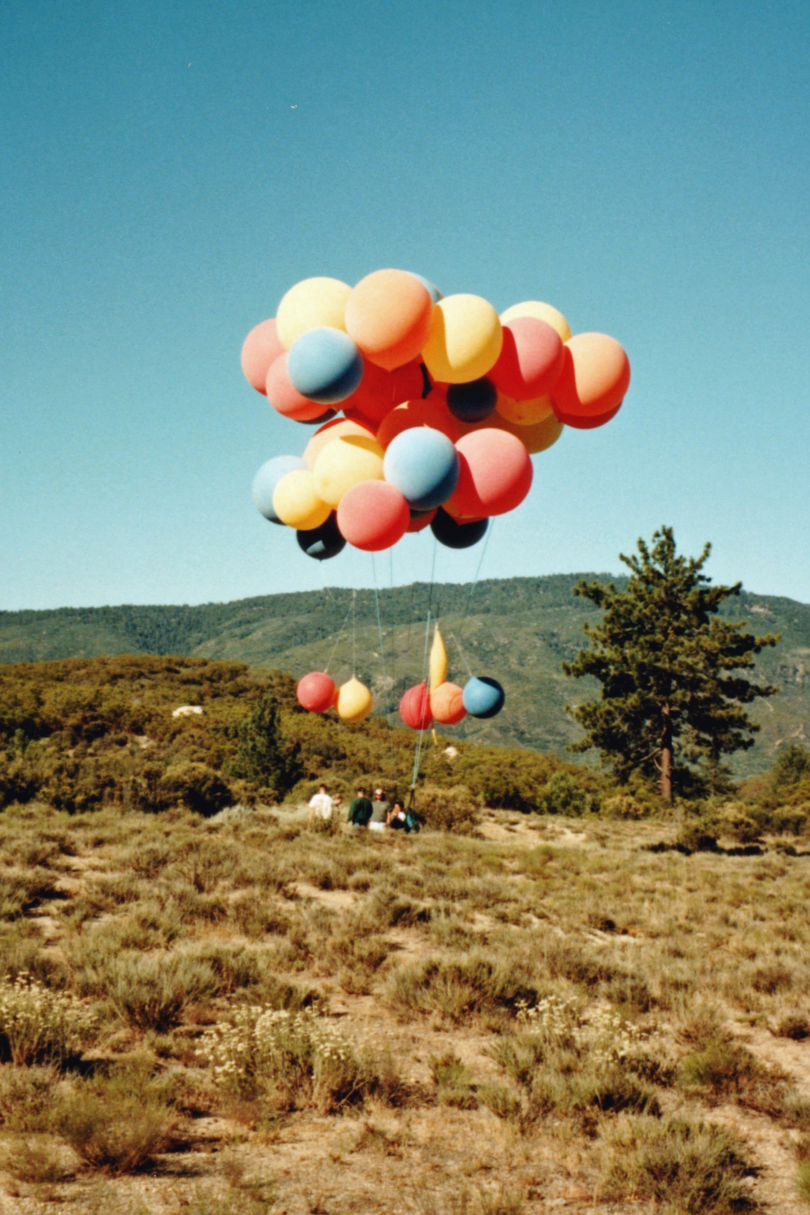 I dropped behind a line of low hills and lost radio contact with Ernie. I released some more ballast and leveled out at a few hundred feet. My speed had slowed considerably from what it was when I was higher, now just five miles per hour or so. I flew for ten minutes over some pretty terrain – small pine trees alternating with scrub and meadows, and large jumbles of rock. I saw what looked like a camping area. Figuring that there must be some kind of access to this spot, I burst two balloons to drop in to about fifty feet above ground, then ballasted to level out again. I burst one final balloon, and floated down to land softly on my feet.