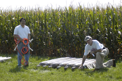 As the date of the flight approached, the weather once again looked uncooperative. I was scheduled to fly on Friday afternoon. A cold front was on its way into the area at around that time. After changing the Friday forecast from rain to no rain about four times in the preceding week, the forecasters finally decided Friday afternoon would be dry but with more wind than I could inflate in. Things would calm down by sunset, but too late for me to get the balloons filled. Hoping they were wrong, Larry and I spent the morning setting up to do the inflation next to a cornfield bordering the Pontiac Rec-Plex. |