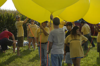 | Our volunteers from Caterpillar showed up at 4 PM. The wind had slowed some in the past hour, but was still occasionally gusting up high too high to get the balloons inflated. We waited around until 4:45, the latest possible time we could start and hope to be ready for a decent flight before sunset. It seemed like the wind had slowed a bit more, but conditions were still marginal during the gusts. Hoping that the forecast was right about decreasing winds, we began inflating the balloons in the shelter of the corn field. |