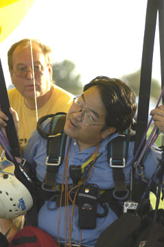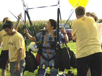 The wind bounced the balloons against one another hard enough to burst one. But it was never quite strong enough to drag the balloons on their sandbags, and continued to slowly subside. The inflation volunteers finished their work in record time. By the time I got into my harness, conditions were ideal for flying. The crew walked me across the road, to where the hot-air balloons were getting ready to launch. |