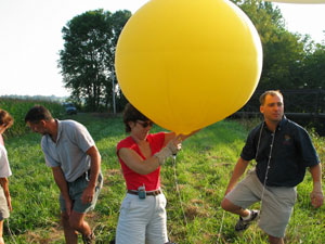 Finally, nearly an hour into the flight, my crew radioed to say that they were getting pretty close to catching up with me. I had been descending steadily for the last twenty minutes, and was now at just a few hundred feet. Ahead were several large corn fields, with a line of trees and a stream running through the center. A road ran from the main road out to a bridge that went over the stream. I described the location as best I could to my crew. They seemed clear on what main road I was talking about, but not clear on the exact location. I was still moving fairly briskly. I didn't want to wait for the windspeed to increase on the surface, so I decided that I would land -- easy enough if crew was there to grab me, probably unpleasant if I had to stop myself in the corn field. I released a balloon to drop in farther, dropped a little ballast to level out again. I was into the corn field, then I was moving along the tops of the trees. I saw vehicles on the road into the corn field -- crew was there! They pulled up out of sight, where the road crossed the stream and the line of trees. "Dropline," I yelled. "Dropline-dropline-dropline!" Clutching the roll of webbing strap, I cleared the last of the trees and saw people down on the road, one of them with a pink hat. |