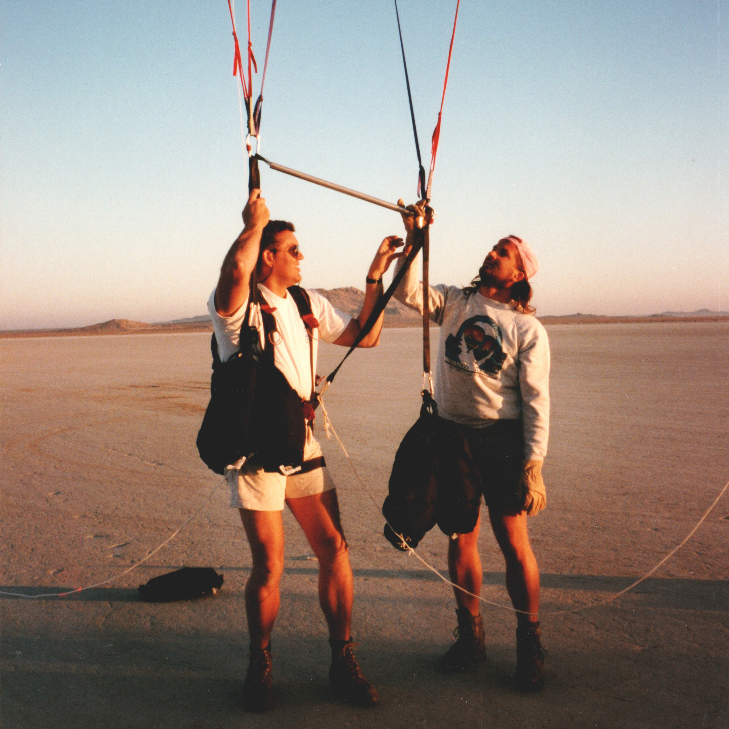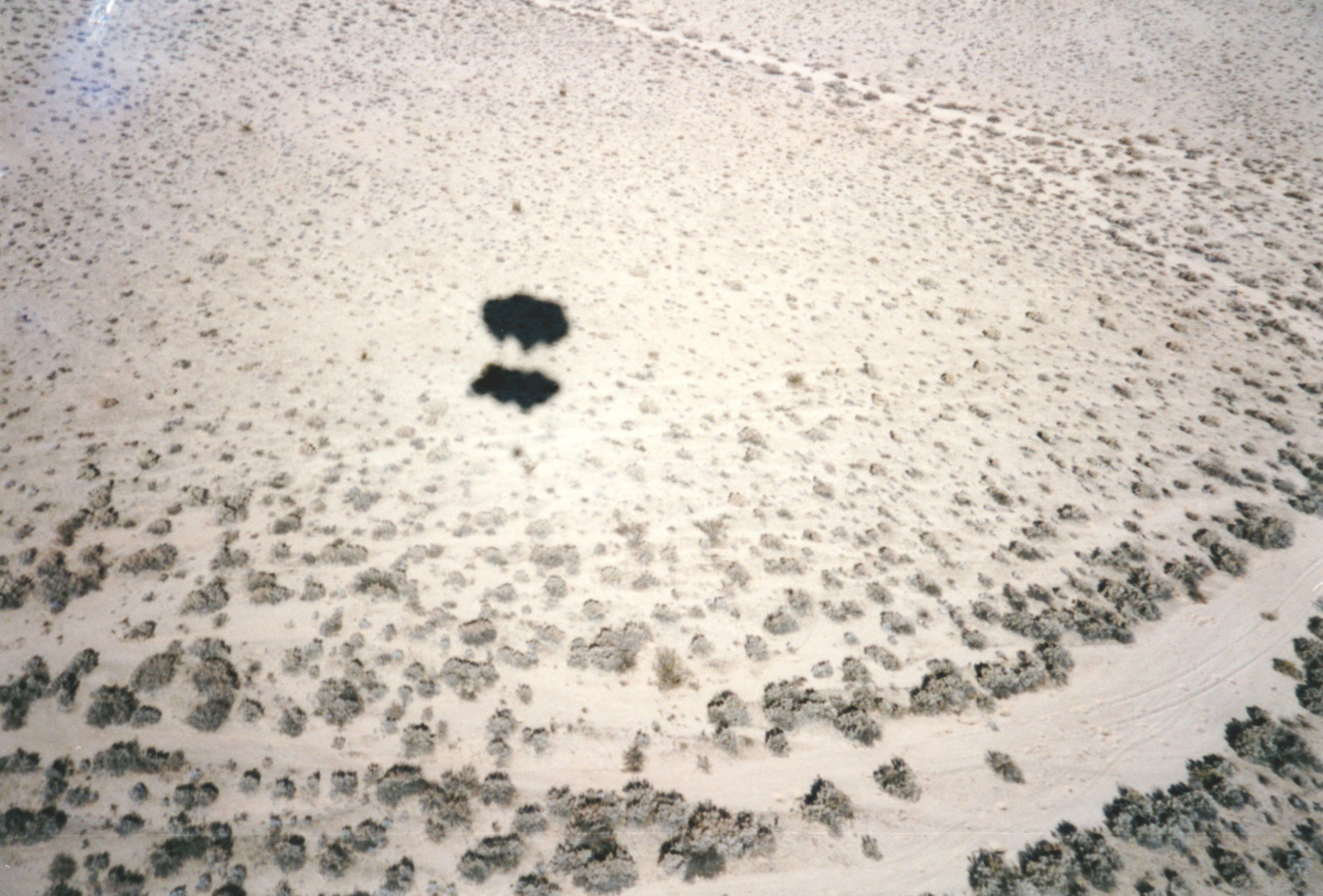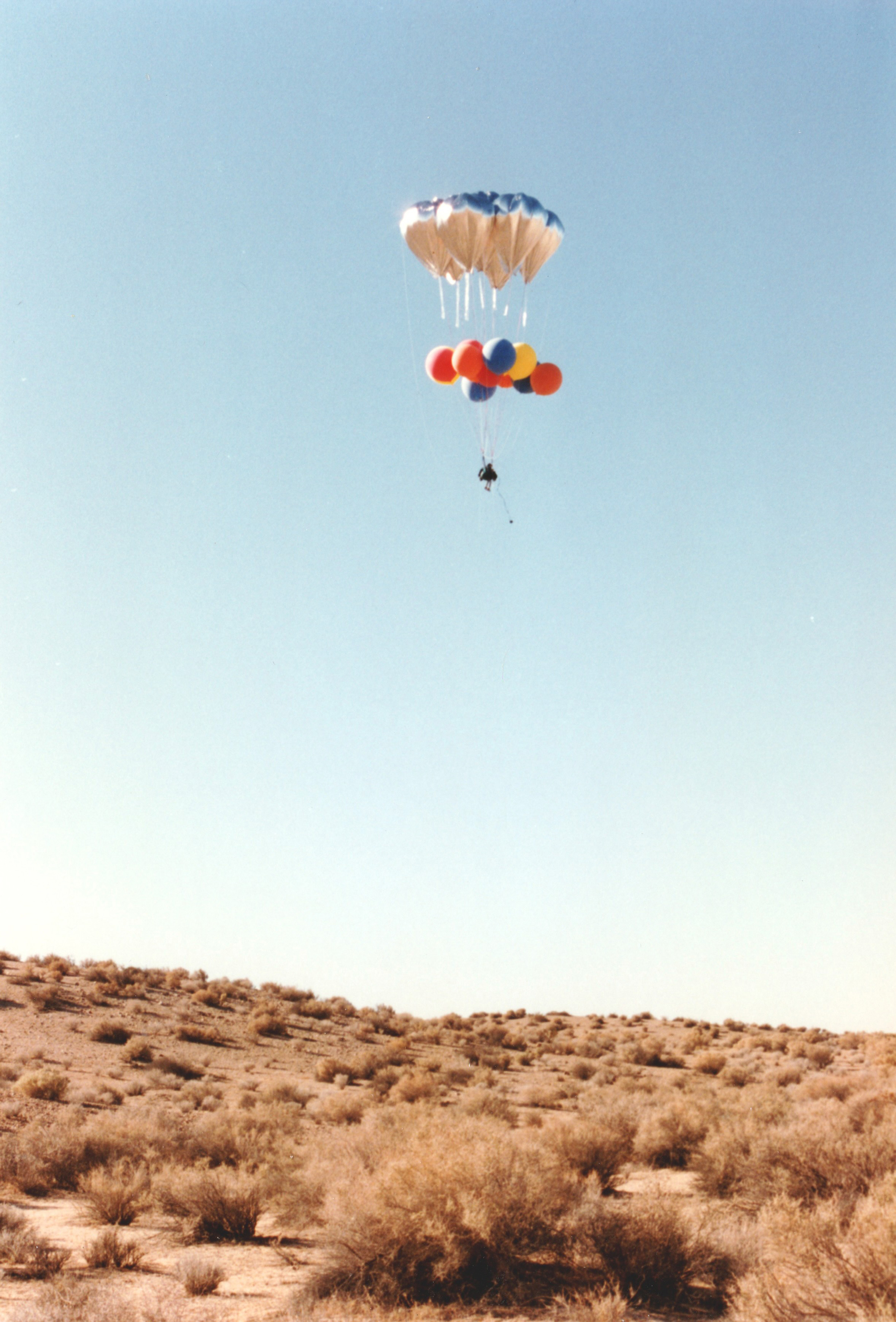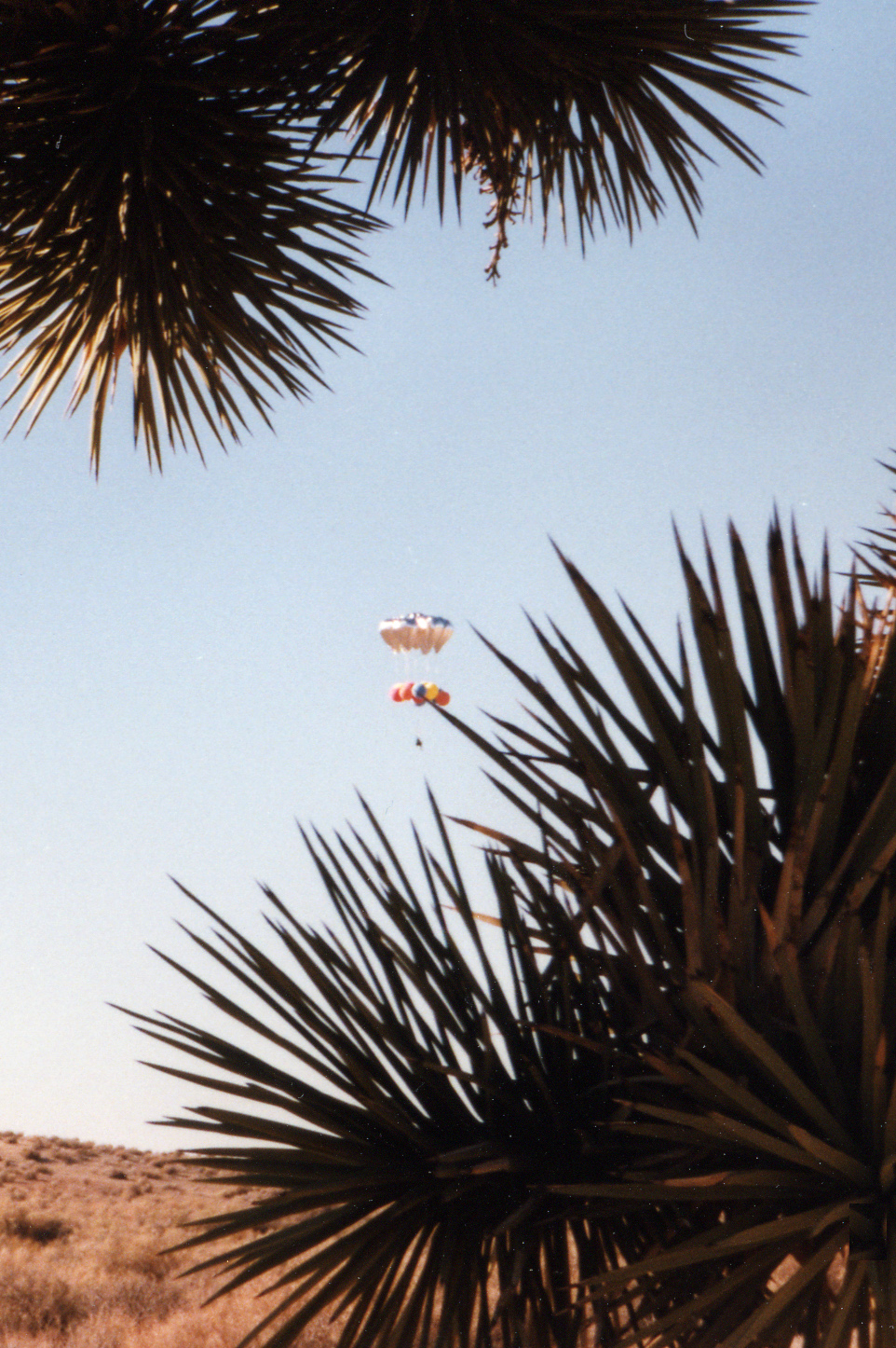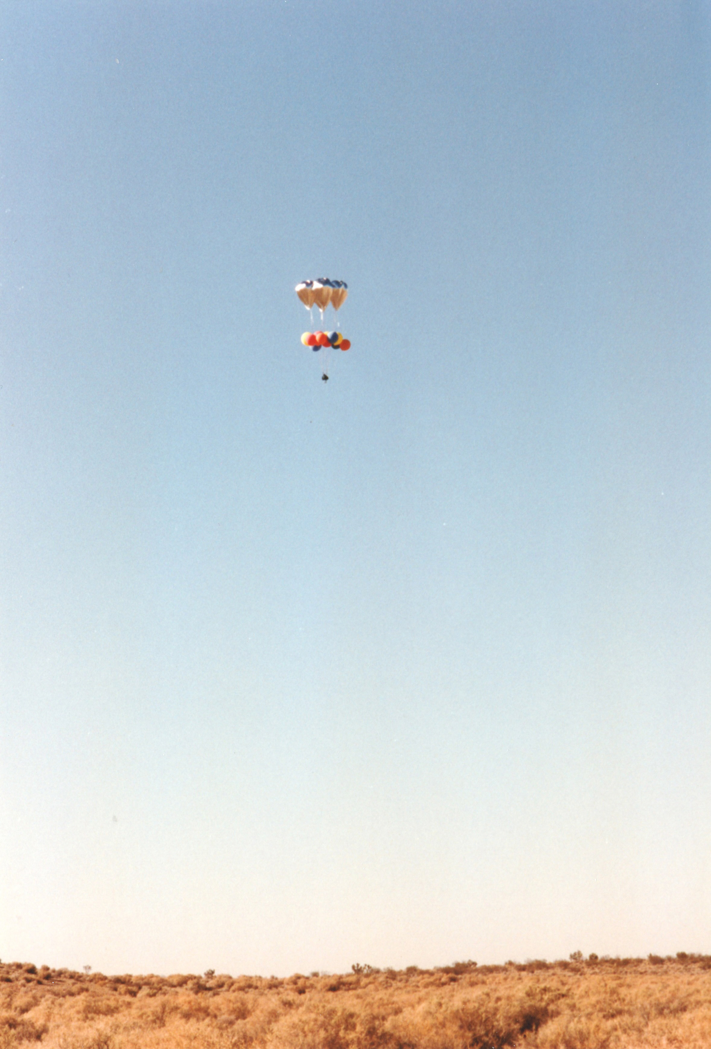 I was now at a few hundred feet, still descending. Ahead of me was open desert, dotted with small bushes. The chase vehicles were on a dirt road nearby. I told Ernie I was coming in for a landing. I threw my webbing drop-line and released some water from my ballast bags to slow my descent.