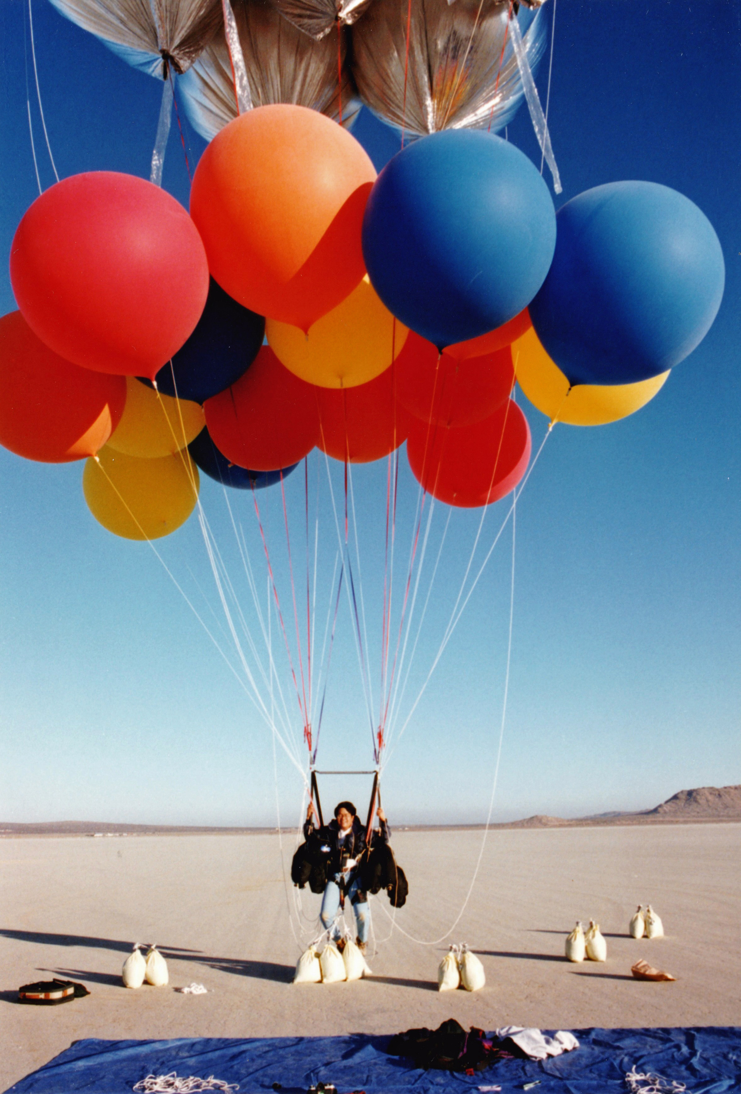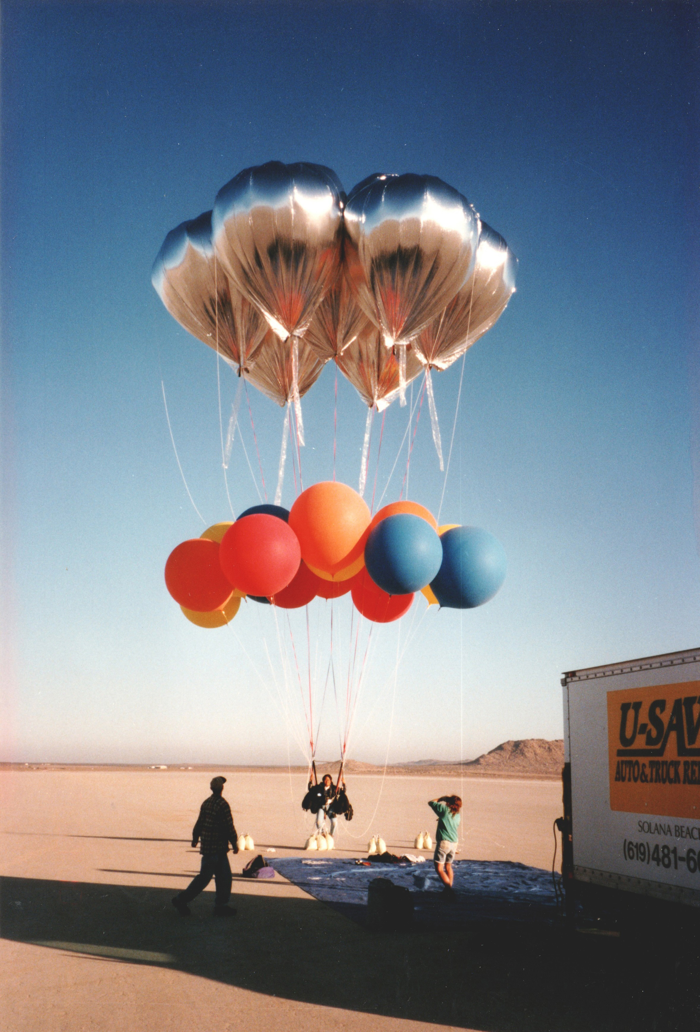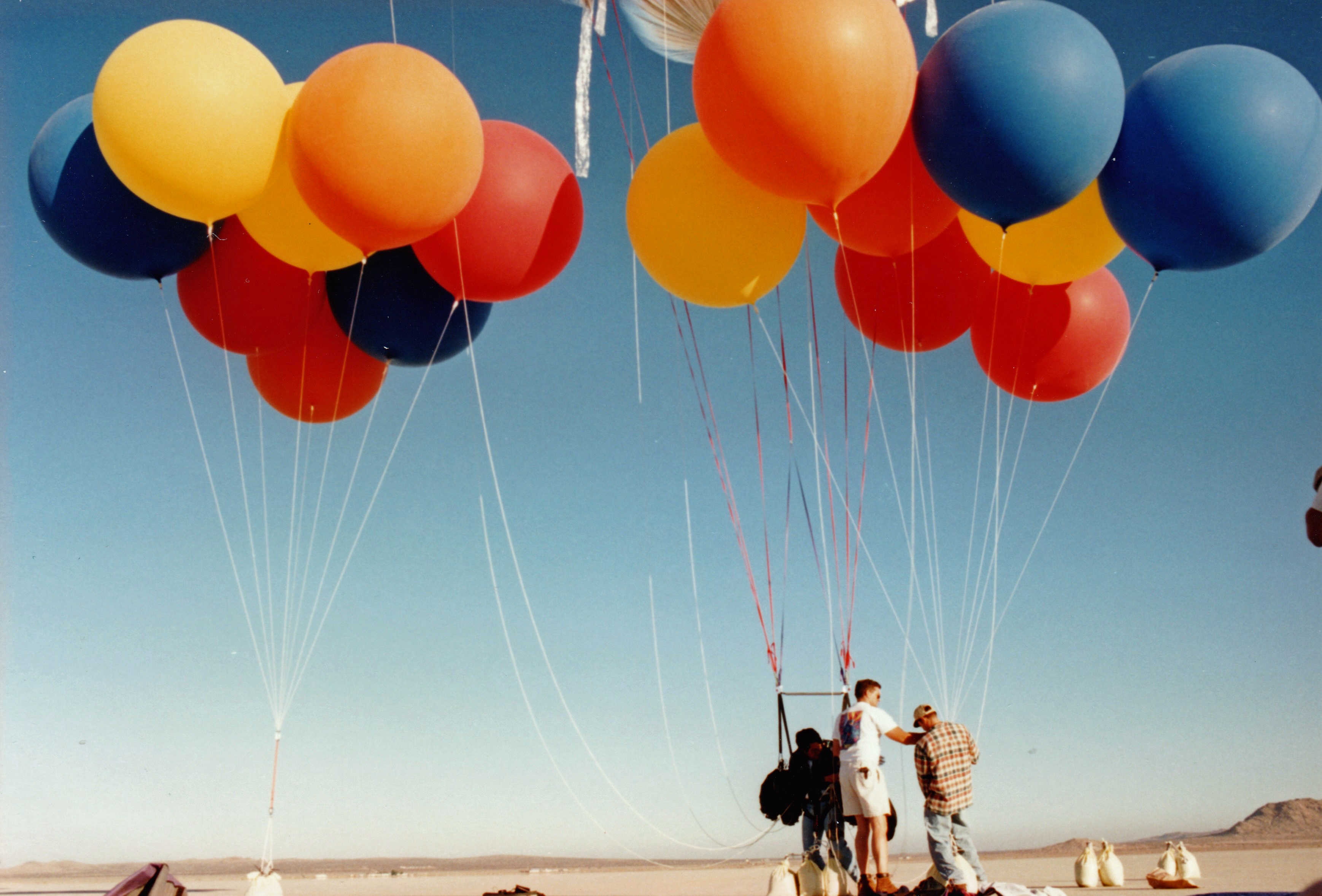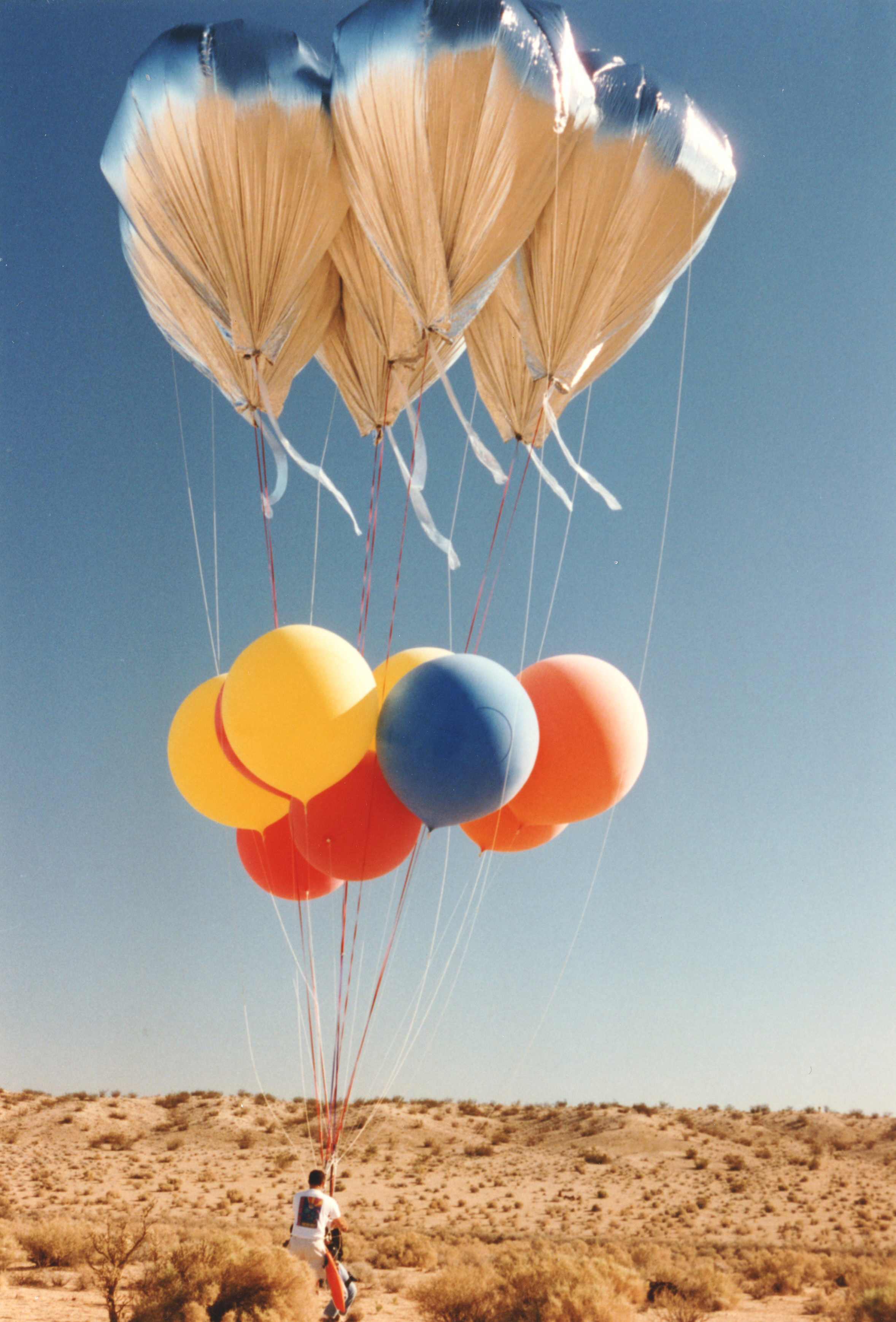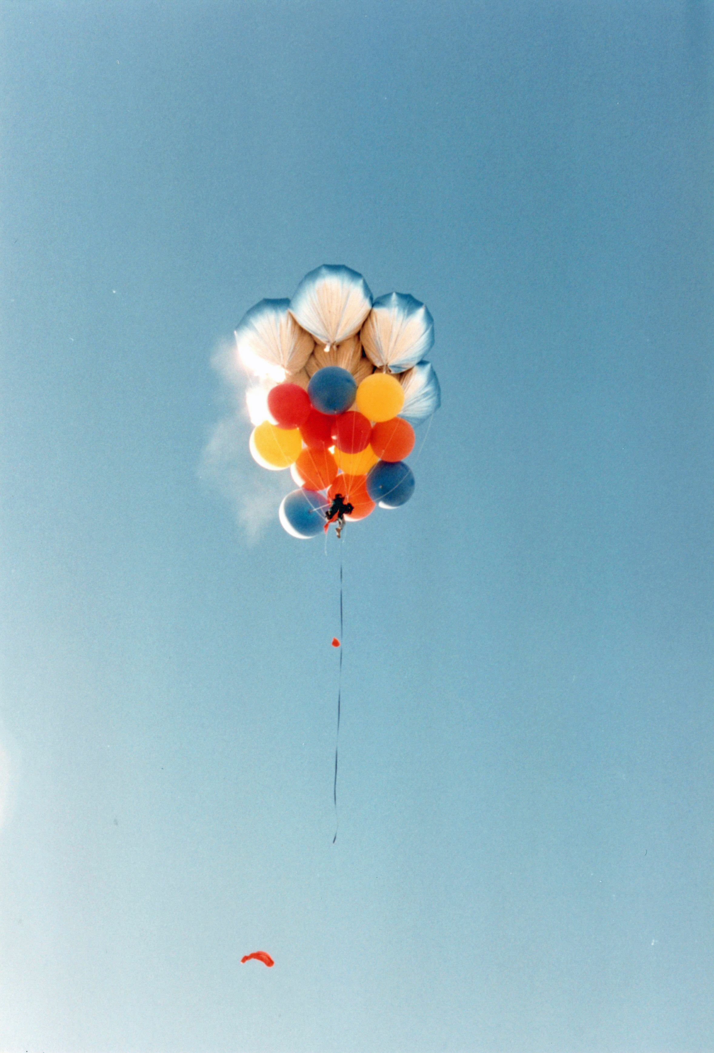 Unfortunately, I released too much water and began climbing again. I called Ernie and told him to regroup a few hundred feet downwind. I pulled down two latex balloons and burst them, releasing a cloud of white talc. I began to drop in again at a reasonable rate.