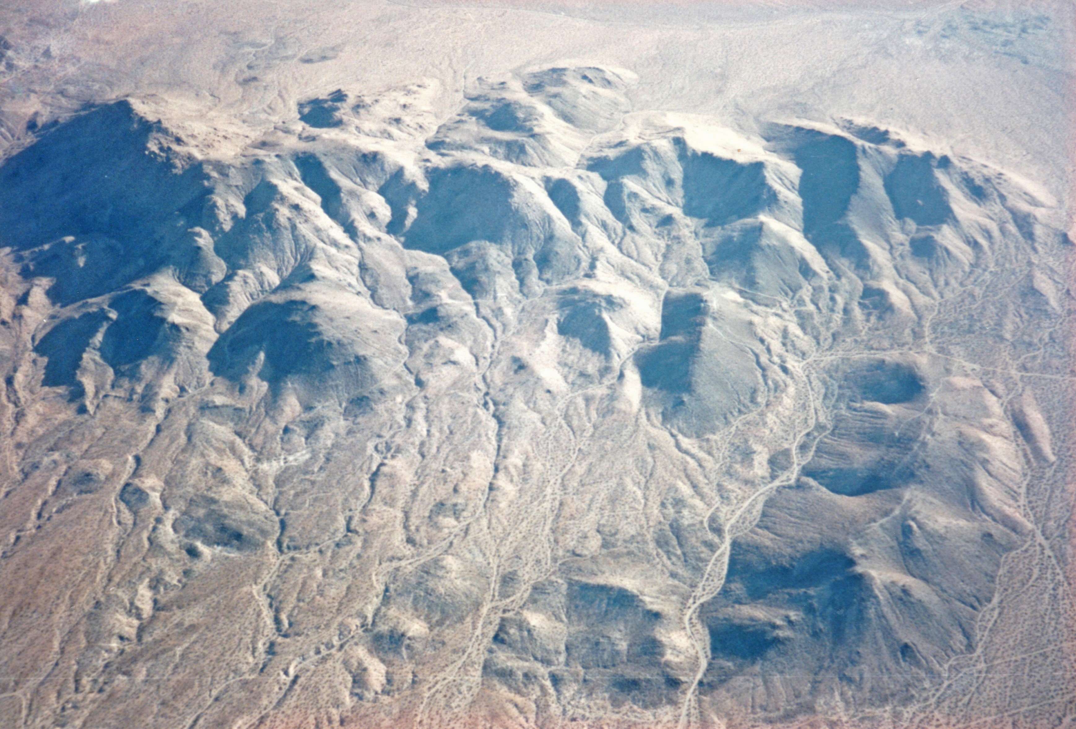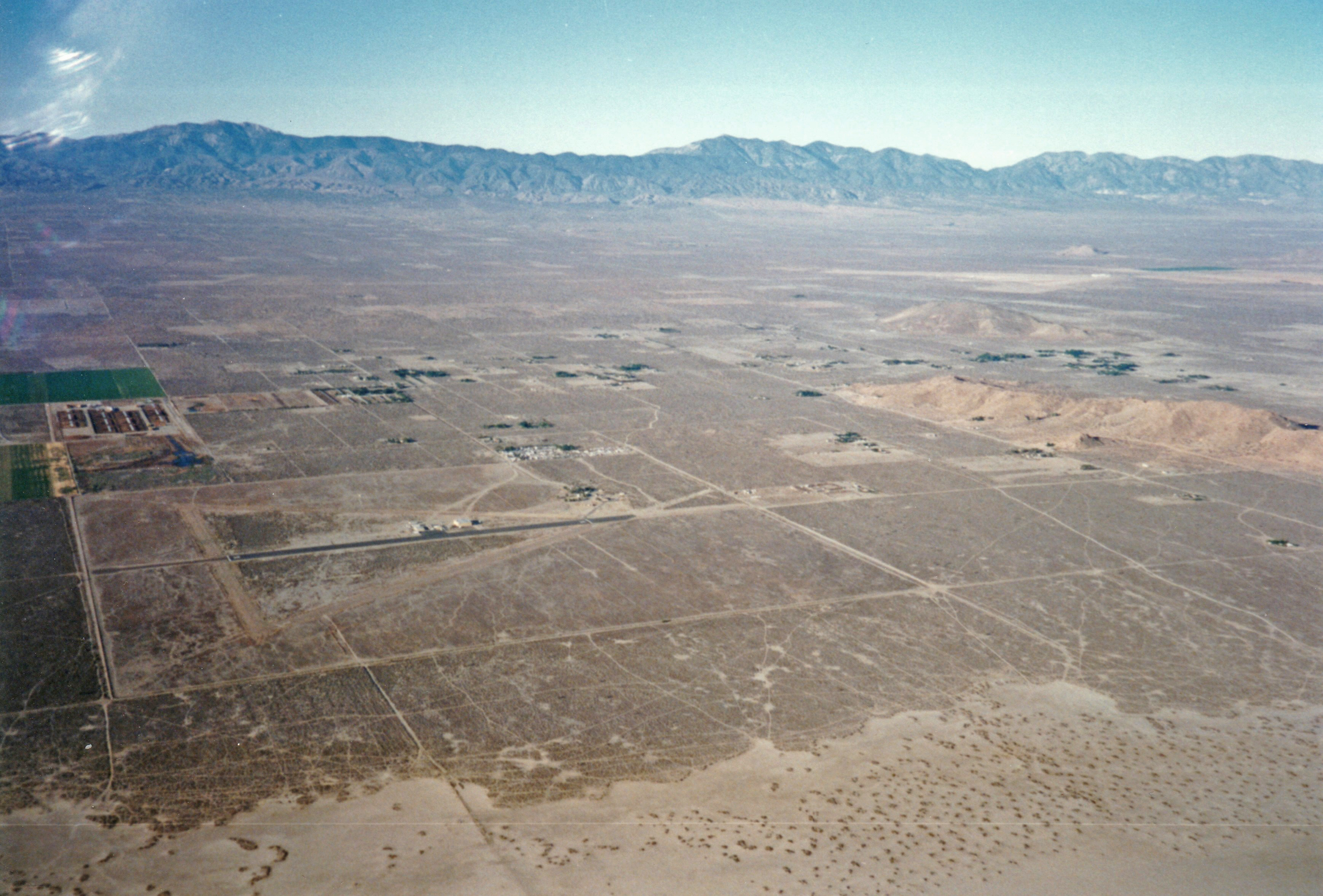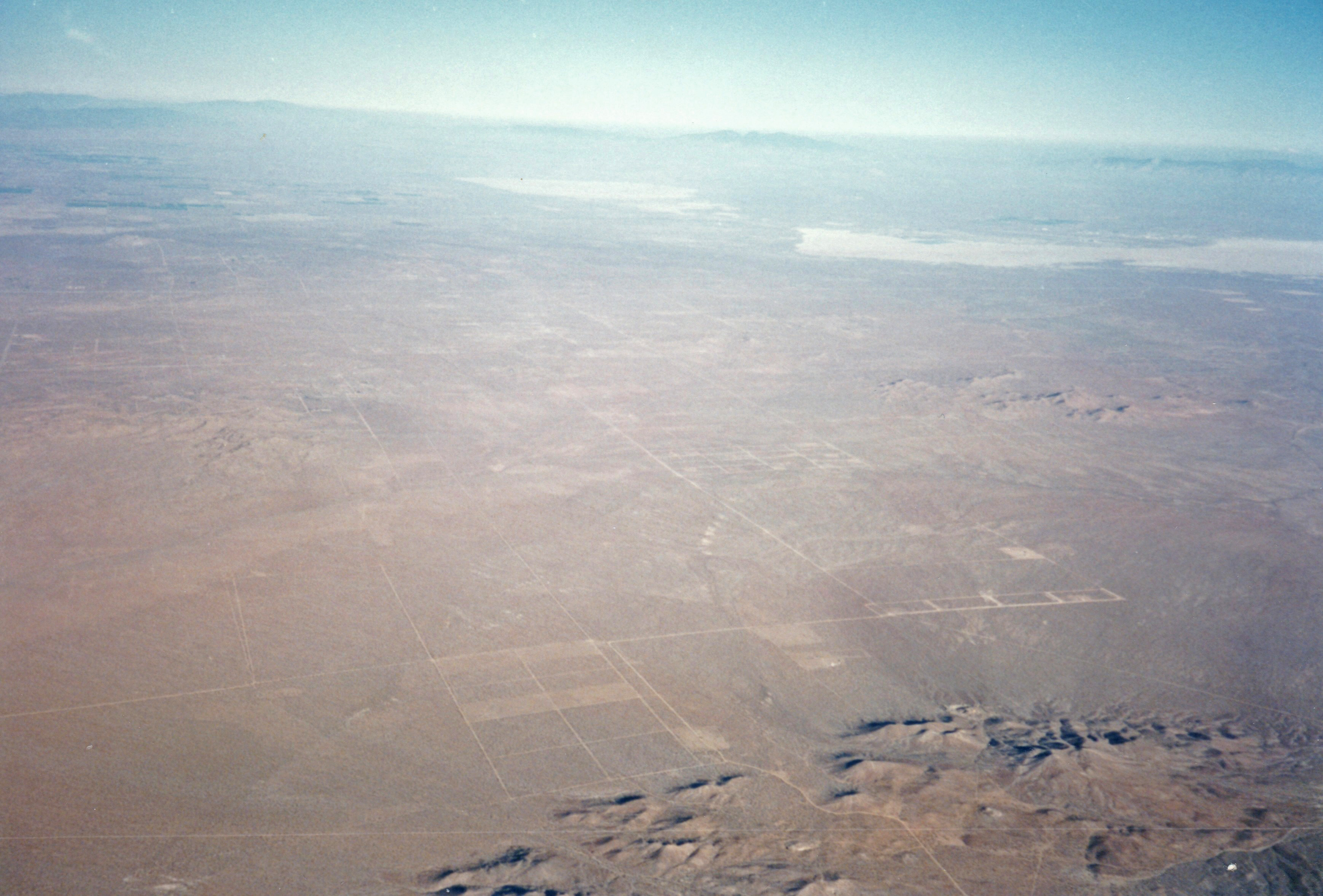 The off-white of the lakebed gave way to the mottled brown of the desert, with its light grid of dirt roads and the occasional green of irrigation. Winds were generally out of the southwest, and I was off the lakebed within a few minutes.