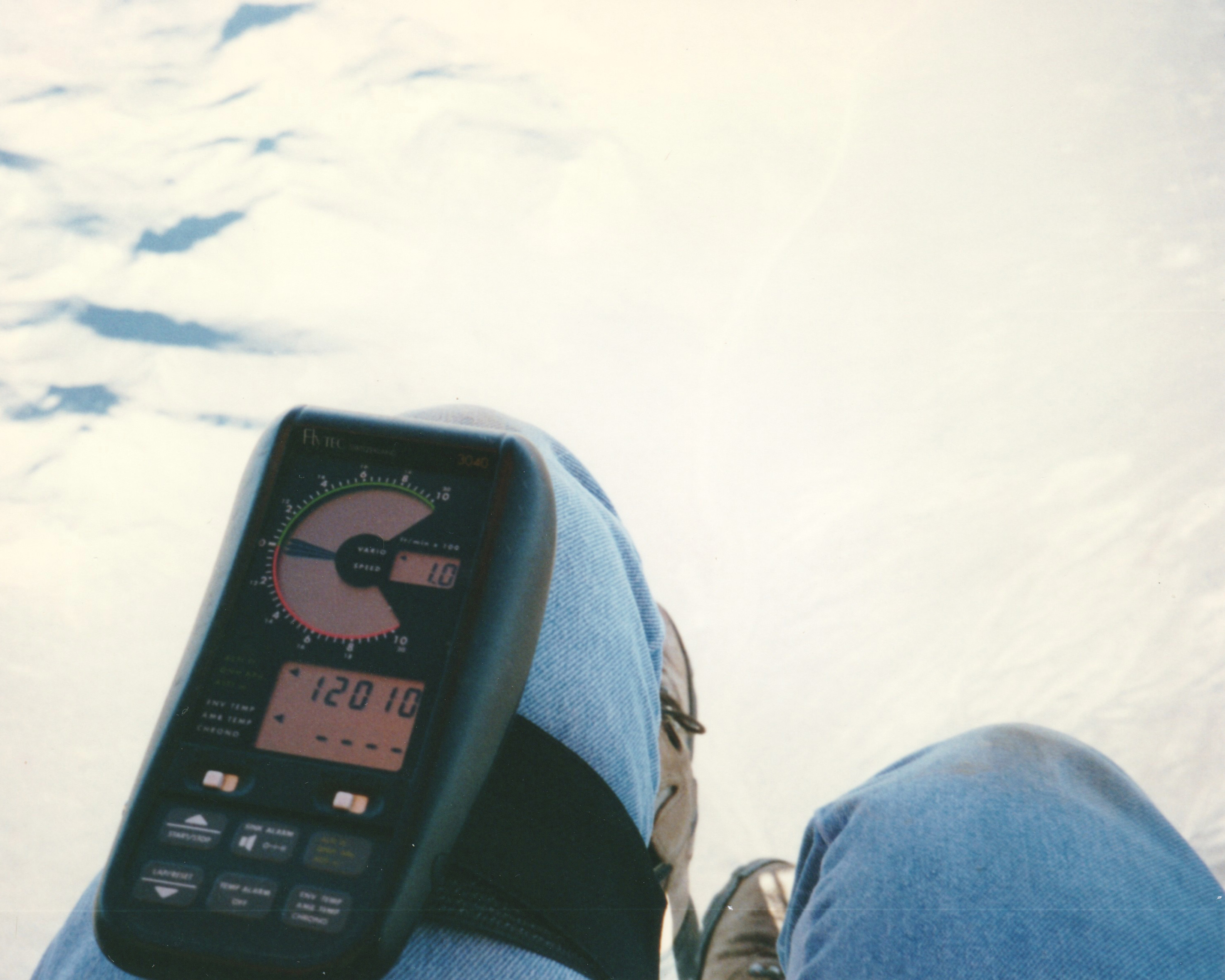 I pulled down a latex balloon on its string and opened the knife on the lanyard around my neck. Looking away, I stabbed. The balloon was inflated to only half its maximum volume, so it burst with a loud "fllmmphh" rather than a bang, releasing a bit of the white protective talc that the balloons were coated with for storage. I looked at the vario strapped to my hip. The needle bobbled, then showed me descending slowly. |