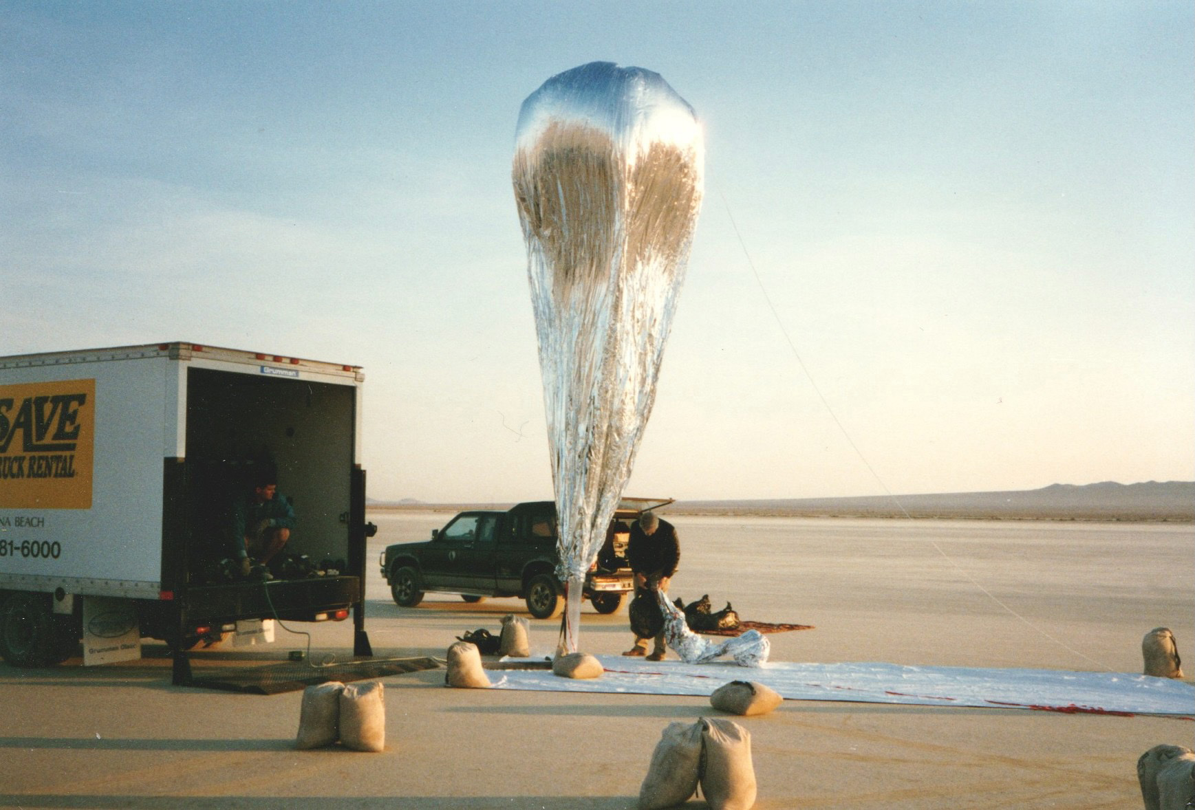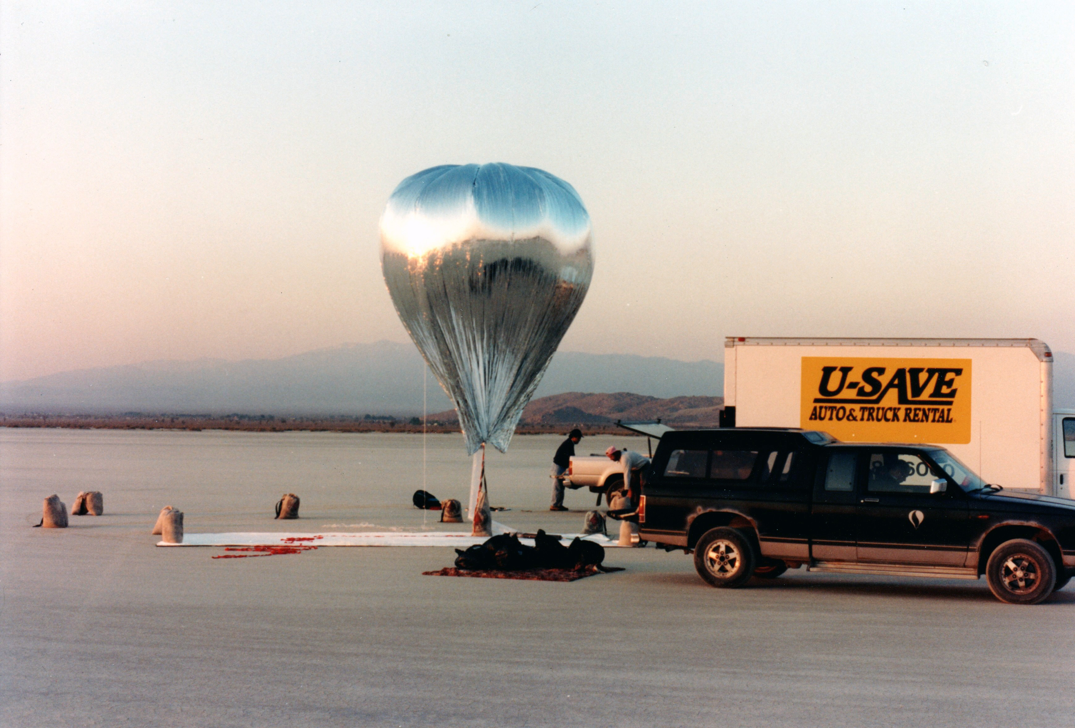 I decided to fly at the El Mirage Dry Lake northeast of Los Angeles. The lakebed itself is huge and perfectly flat, which allayed my concerns about running into anything. We showed up in the early morning with a rented truck full of helium tanks and started inflating. The first large tank of helium created a ball of gas up at the top of the balloon.