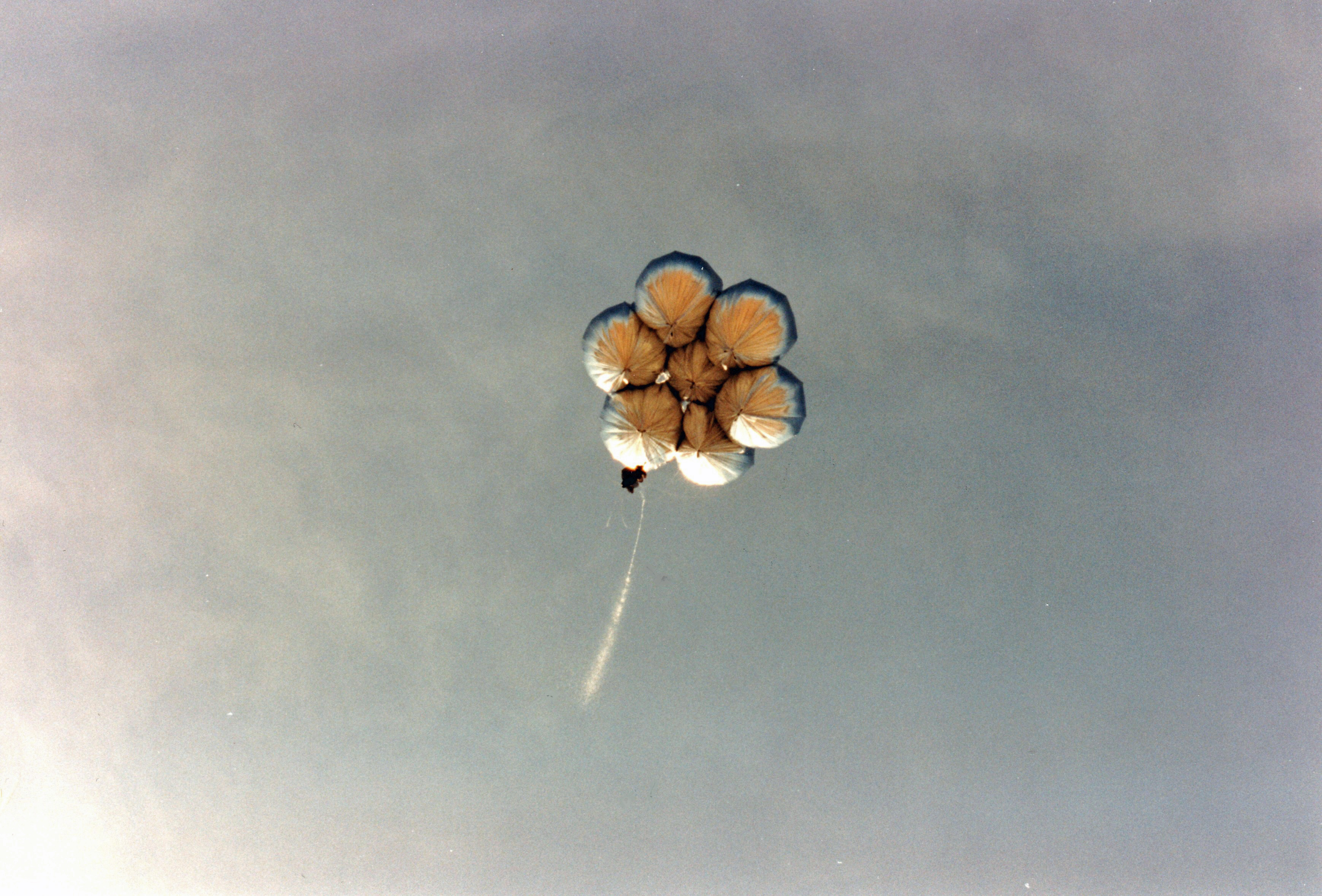 The balloons were designed to be controlled by lines that ran up to the tops of the balloons. Pulling one of these lines would cause the balloon to tip, which would cause helium to spill out of the openings at the bottom. I tried it now, uncomfortably aware that if this did not work I was in for a very long flight. But the balloon tipped, the little vent openings at the bottom of the balloon widened slightly, and my rate of climb dropped slowly from 100 feet per minute up to fifty feet per minute down.