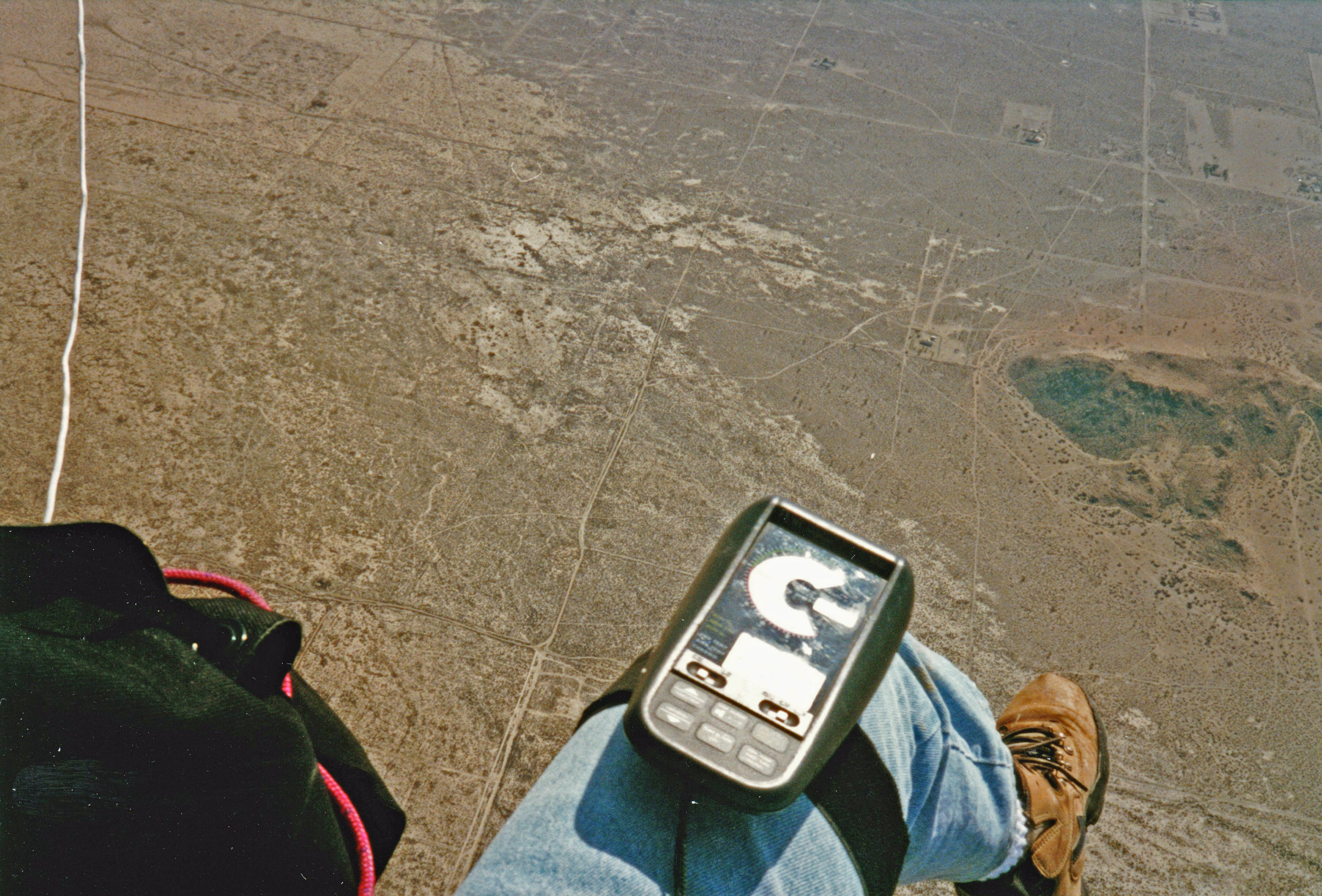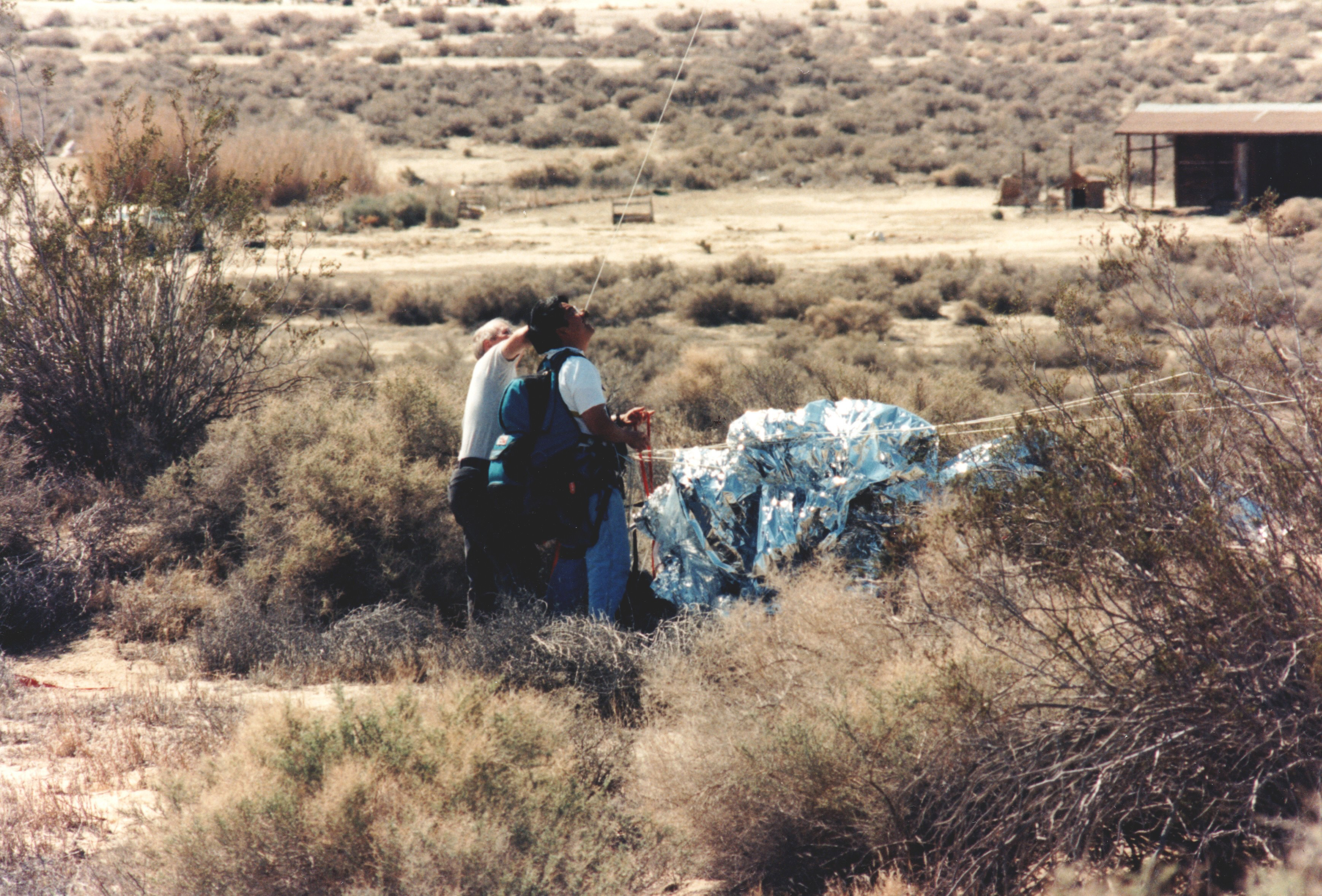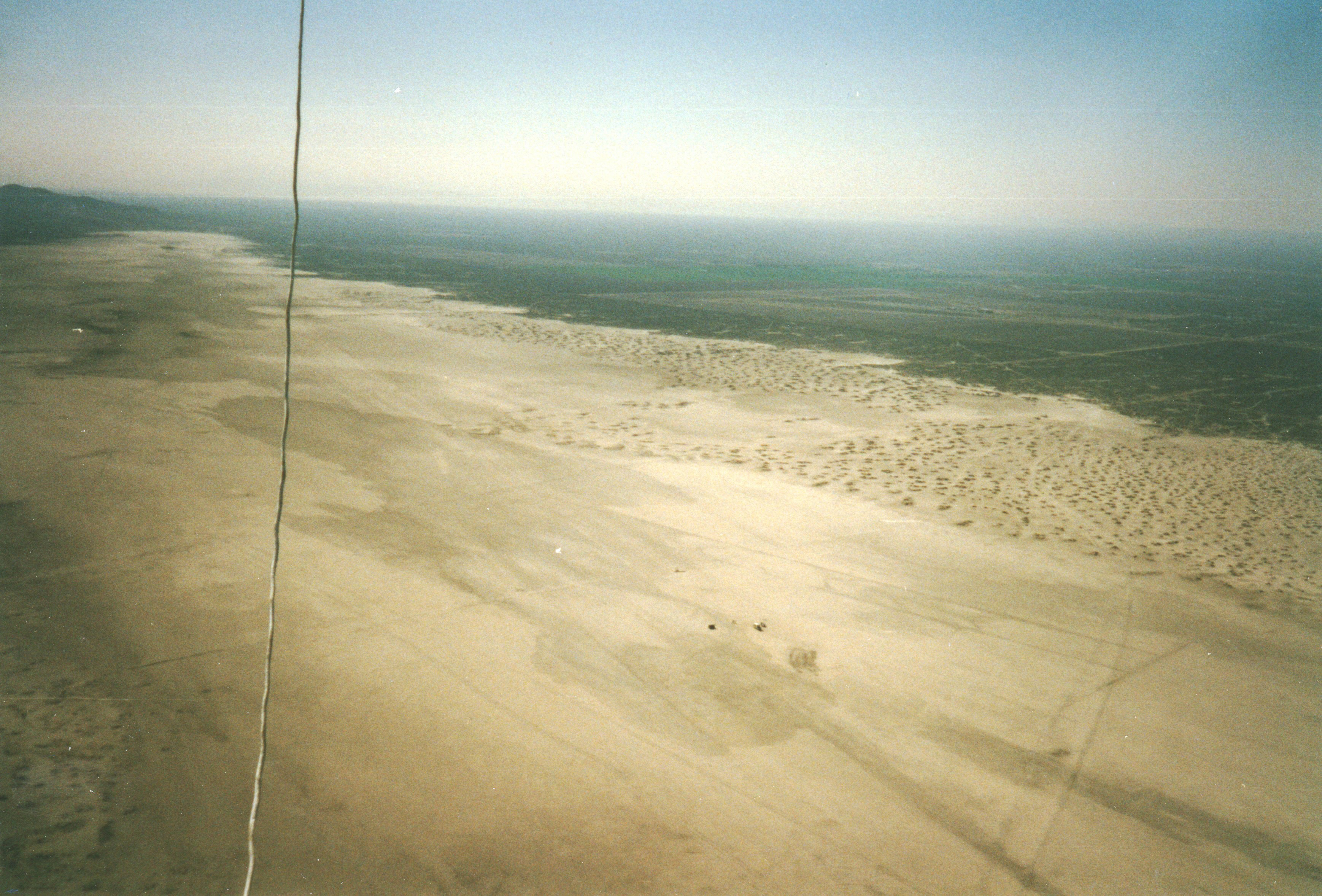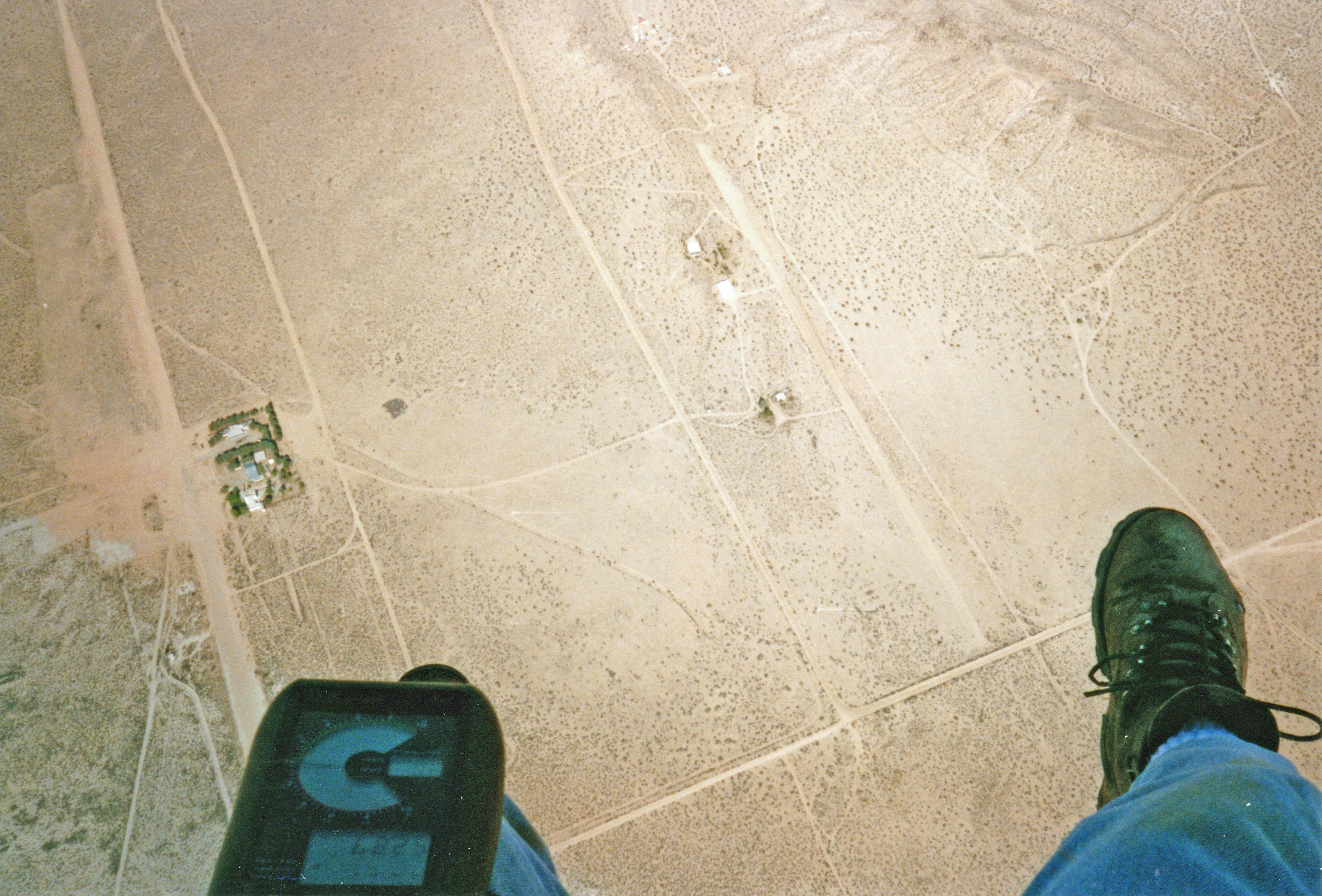 I vented some helium and set up a 200 feet per minute descent. I was off the lakebed now, over an area populated mostly by creosote bushes, along with an occasional battered house. On the radio, Ernie told me that the earlier calm on the surface had given way to light winds. |